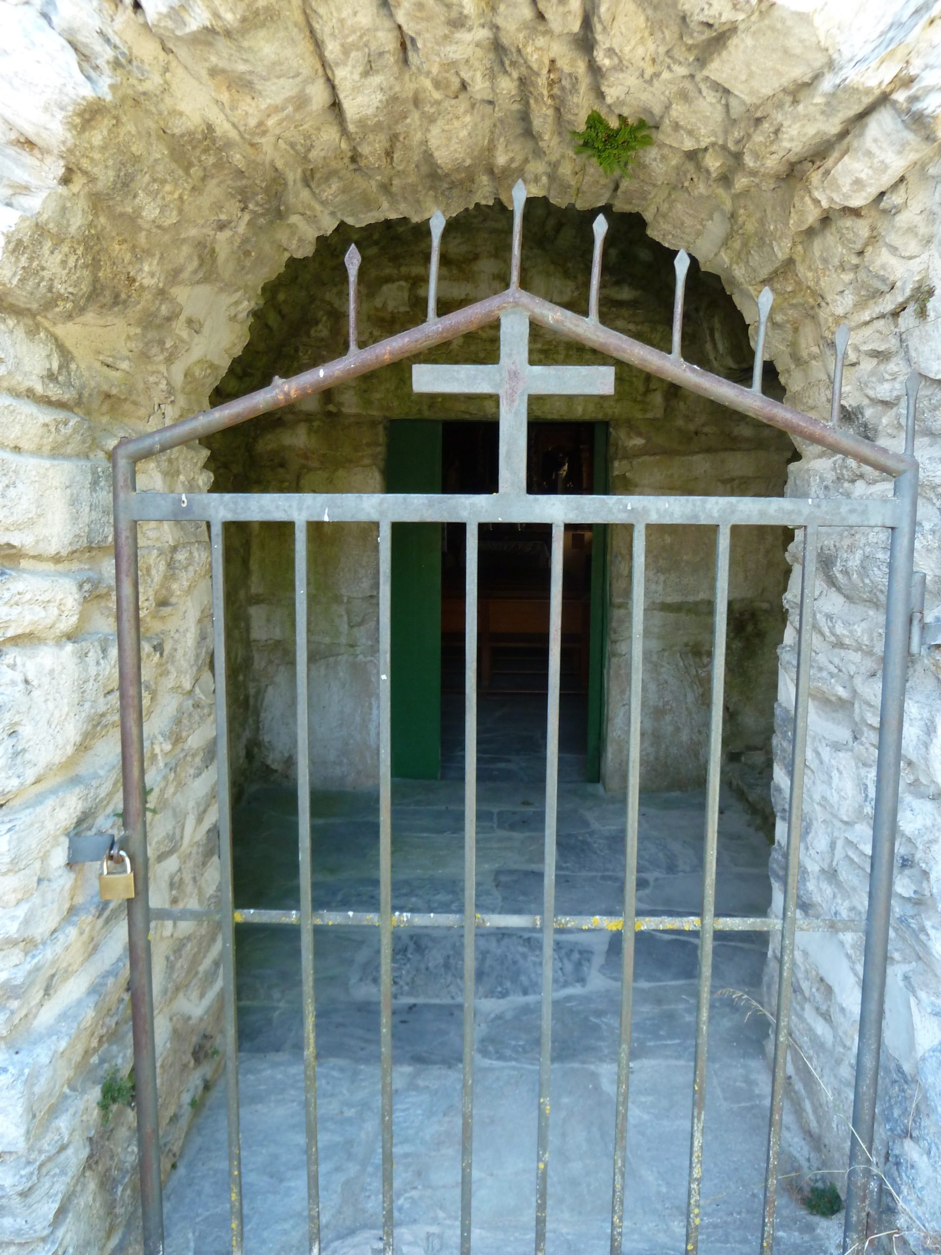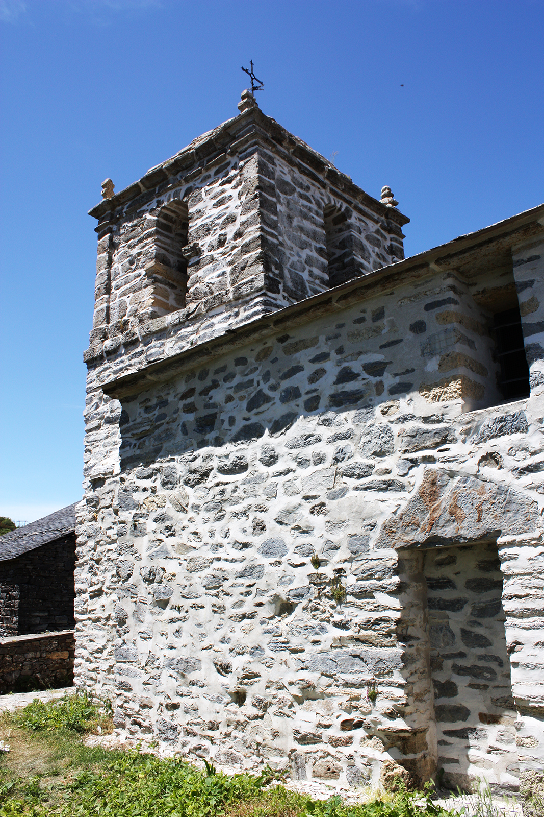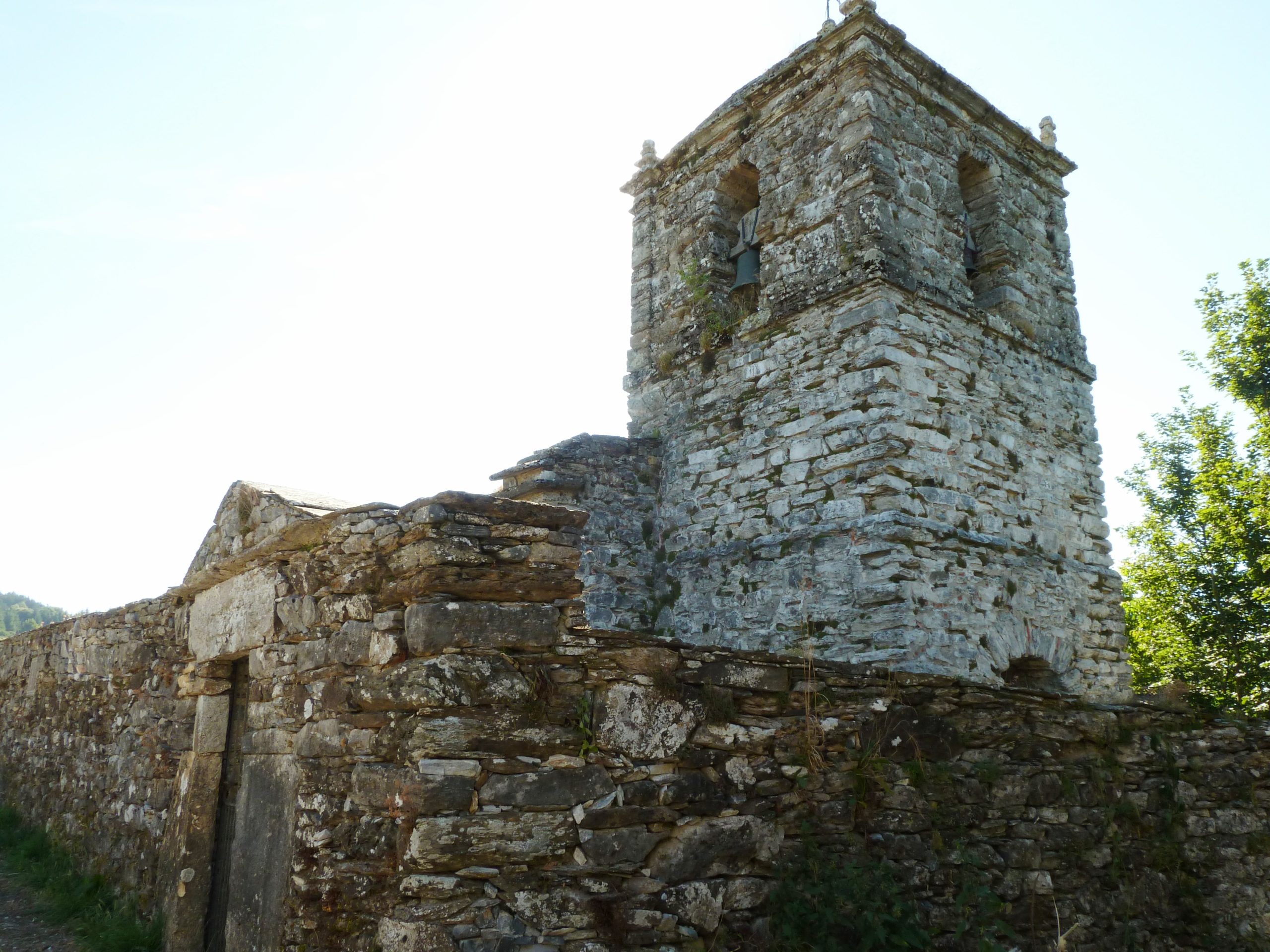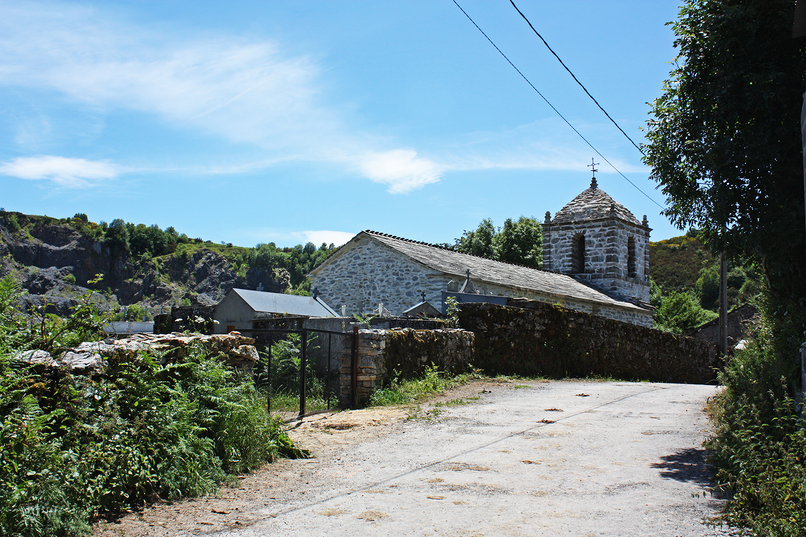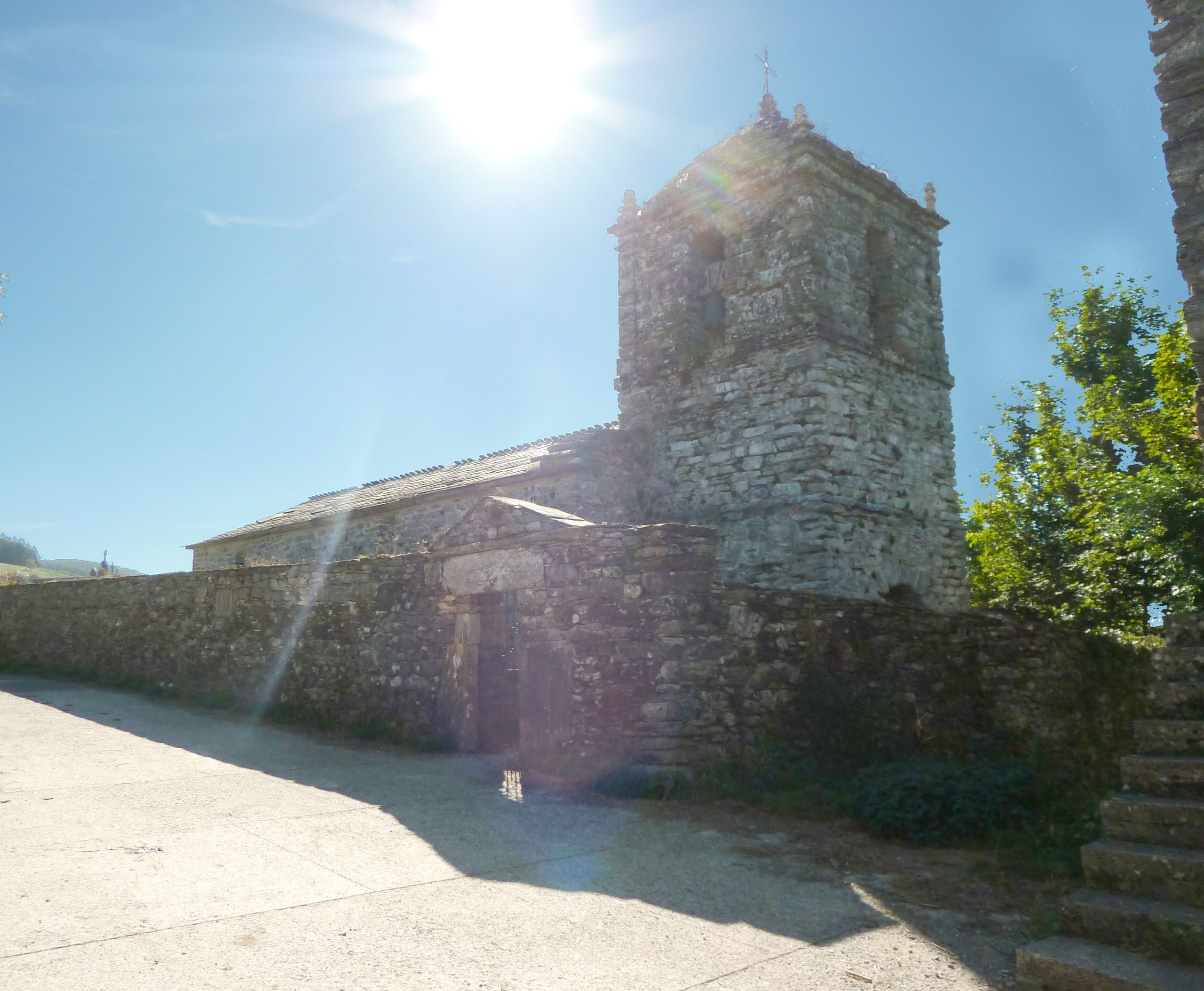 El templo se alza dentro de un recinto cercado por un muro alto que enmarca tanto el atrio de la iglesia como el cementerio parroquial. Construido con mampostería de gneises y esquistos trabados de mortero, refleja la historia de sus muros y del paso del tiempo por ellos. Liberados de cualquier ornamento, tanto los muros perimetrales como la fachada, se presentan contundentes en el núcleo poblacional.