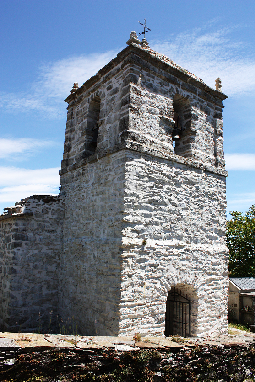 | Fachada y torre del campanario de la iglesia de Liñares. |
