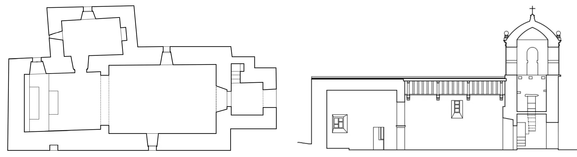 | Plano de la planta (izquierda) y sección longitudinal de la iglesia de San Esteban de Liñares. (José Antonio Franco Taboada, Santiago Tarrío Carrodeguas (dirs.), A arquitectura do Camiño de Santiago: descrición gráfica do Camiño Francés en Galicia, Santiago [de Compostela], Xunta de Galicia, A Coruña, Universidade da Coruña, D.L. 2000). |