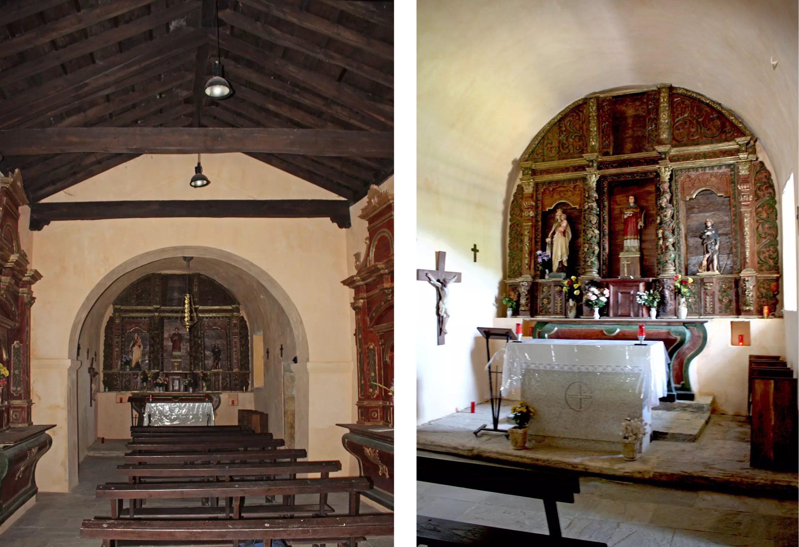 | Interior de la iglesia, vista hacia el presbiterio (izquierda) y detalle del retablo del ábside (derecha). |