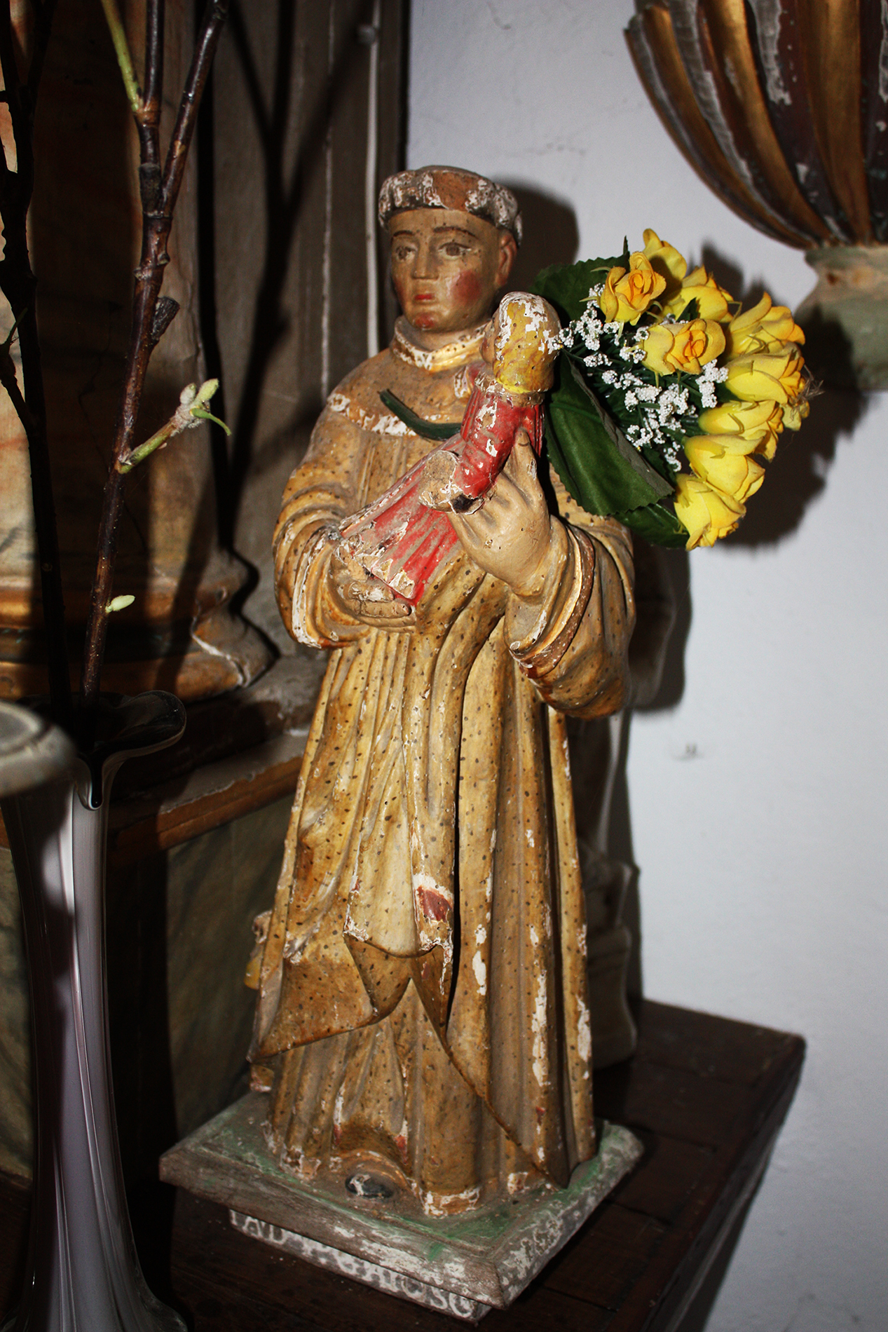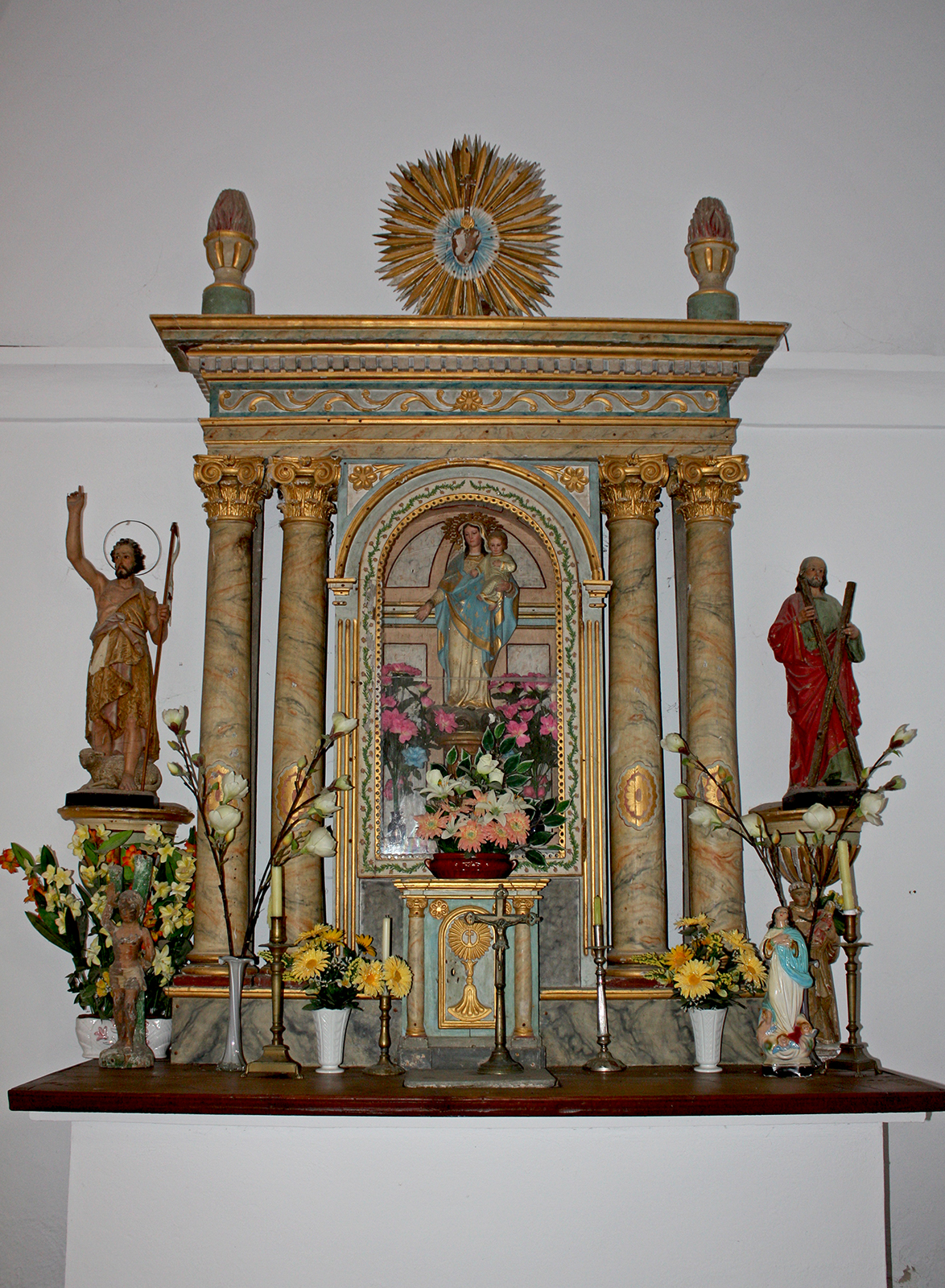 A los lados del Sagrario, sobre el tablero de la mesa, se encuentran dos tallas de madera de cierta antigüedad que representan a San Antonio con el Niño en brazos y a San Sebastián. Sobre dos peanas colocadas en el muro testero reposan las imágenes de san Andrés (a la derecha del retablo) y san Juan Bautista (en el lado izquierdo).