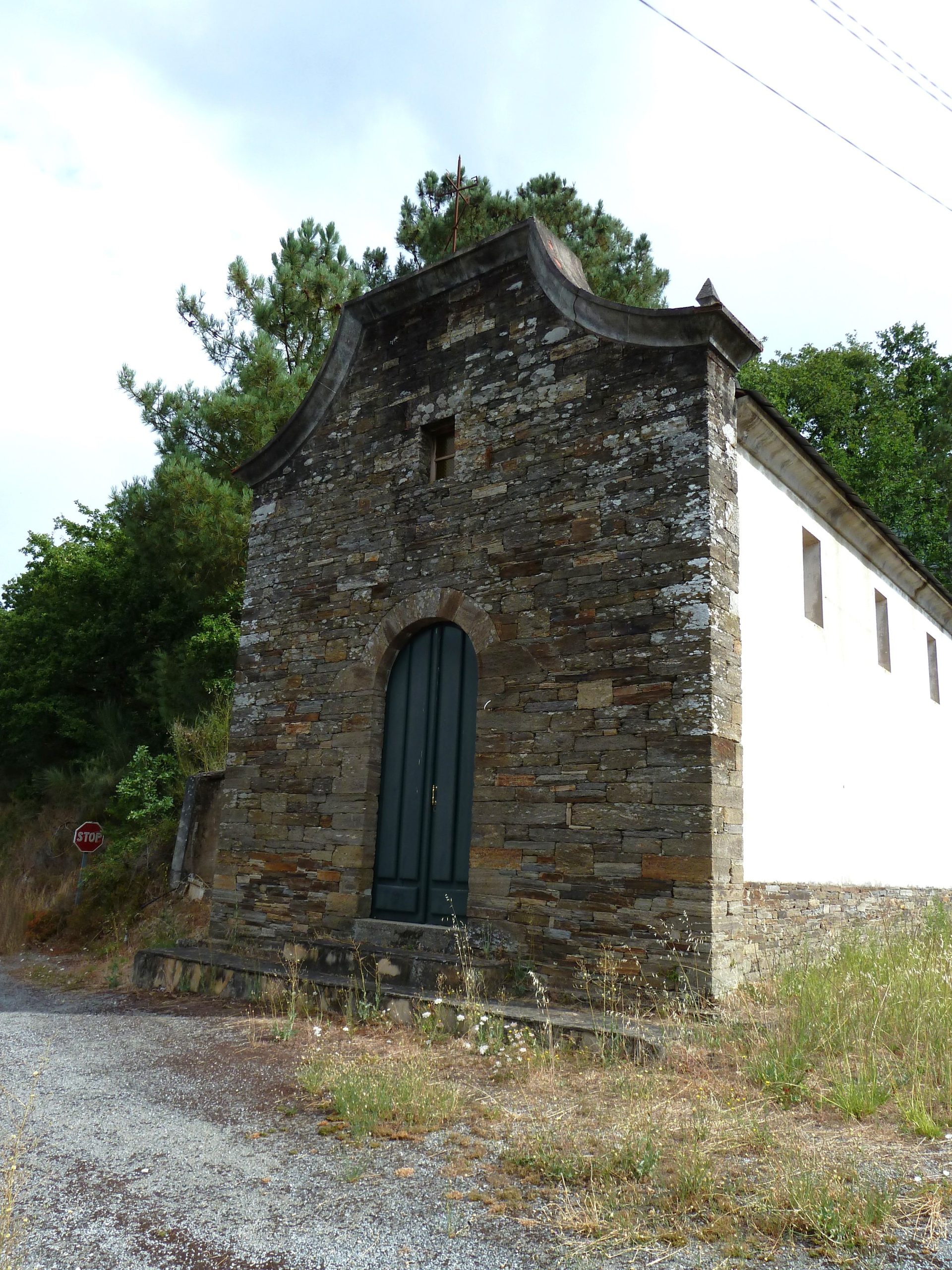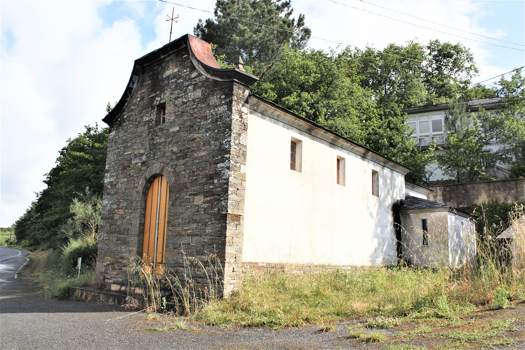 El actual templo se levanta al borde de la carretera C-535 de Portomarín a Sarria y junto a ella se encuentra el cementerio parroquial. El edificio está construido con muros de piedra enlucidos en los laterales, manteniéndose la fábrica de esquistos en la fachada principal. Esta se resuelve mediante un vano de arco de medio punto que da acceso al interior, seguido de un vano de rectangular para la iluminación del interior de la nave. En su encuentro con la cubierta, la fachada mantiene la parte central recta (antes se ubicaba aquí la espadaña, derribada por un rayo, espacio que ahora ocupa una veleta de hierro forjado), mientras los laterales se curvan.