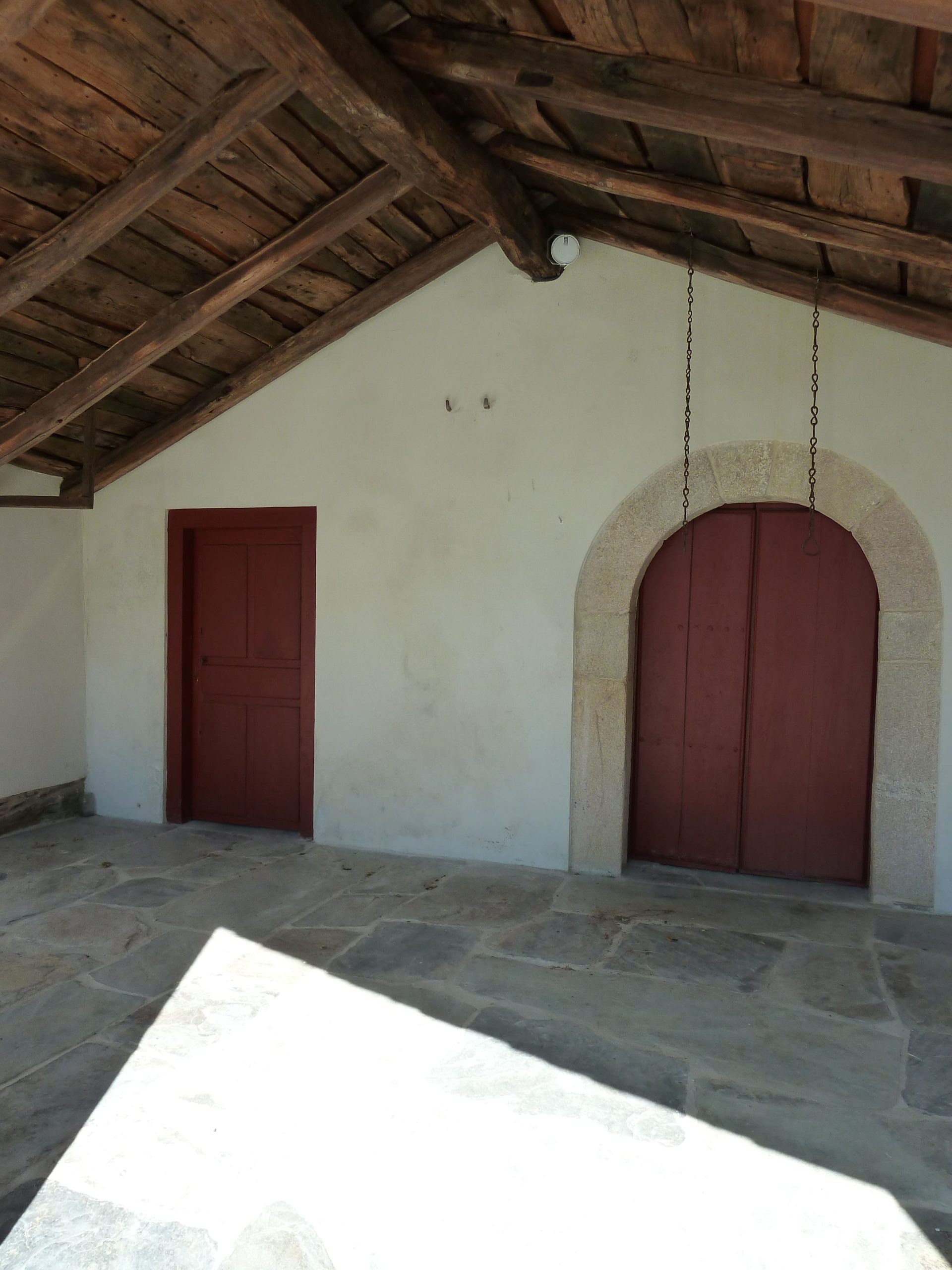 El pórtico se apoya en los muros laterales y en un pilar central de volumen prismático coincidente con la línea de cumbre de la cubierta a dos aguas que lo cubre. La fachada, sin ornamentos, cuenta con dos accesos, el de arco de medio punto correspondiente al original del templo y un segundo adintelado que se corresponde con la nave lateral. Todo el edificio se cubre con pizarra, siguiendo la estructura a dos aguas en el pórtico y la nave y a cuatro en el ábside.