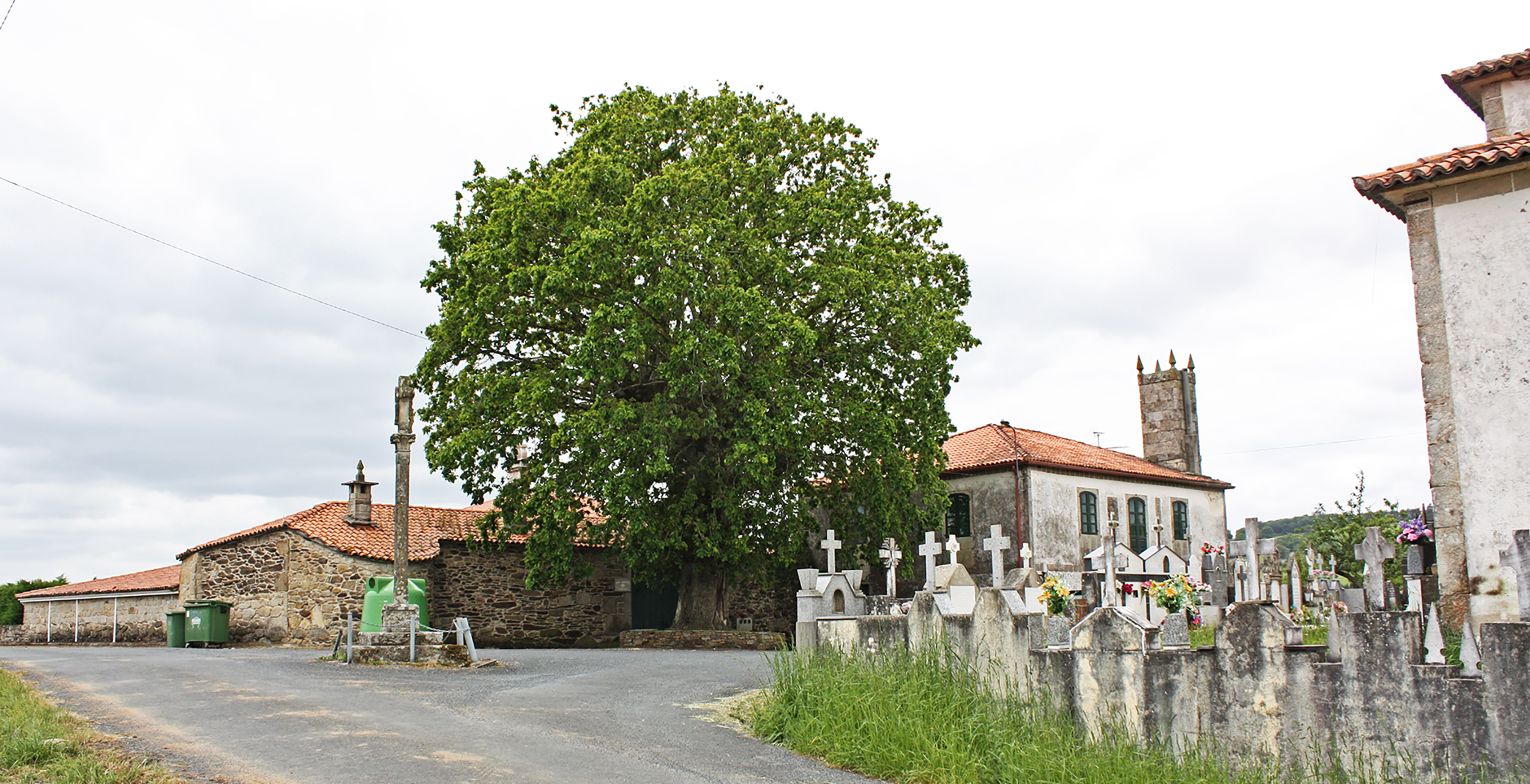 Ubicación de la casa rectoral y Pazo de San Pedro de Meixide, al sur de la iglesia parroquial. |