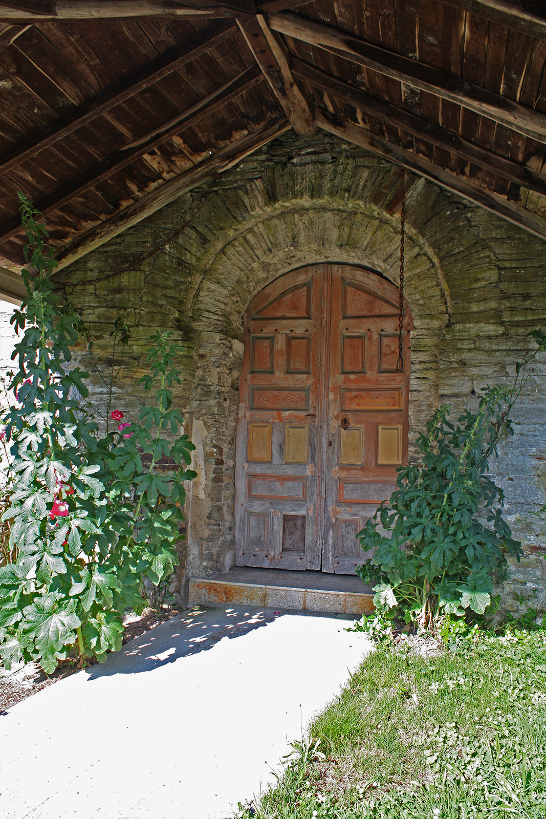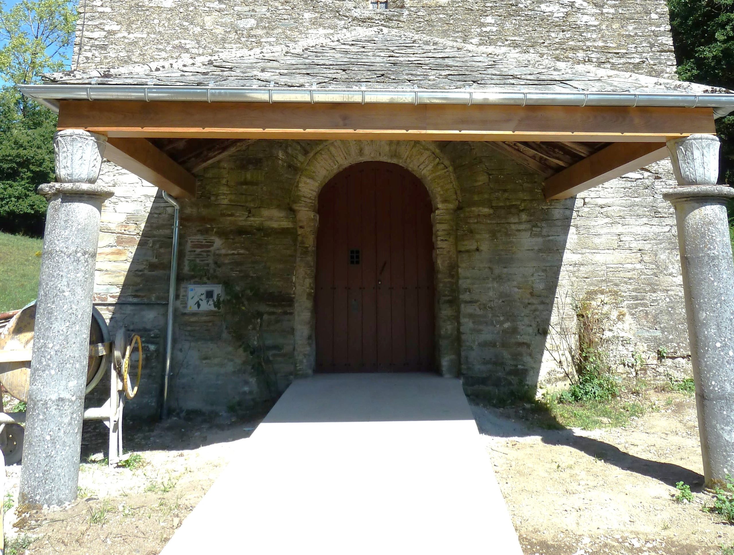 Por lo tanto, habiendo sido sometida a intervenciones, lo que podemos ver en la actualidad es una fachada sencilla de un cuerpo con un vano de acceso de arco de medio punto en el registro inferior, otro de características formales idénticas, pero de menor tamaño, como vano para la iluminación del registro superior y, también una espadaña de doble cuerpo y un solo piso que remata en un frontón triangular coronado por una cruz, también de piedra. El pórtico antecede a la fachada y se apoya en dos columnas formadas por tambores de sección circular con un capitel de flor de loto sobre el que se dispone la cubierta de pizarra a tres aguas formada por una estructura de madera con vigas tirantes.