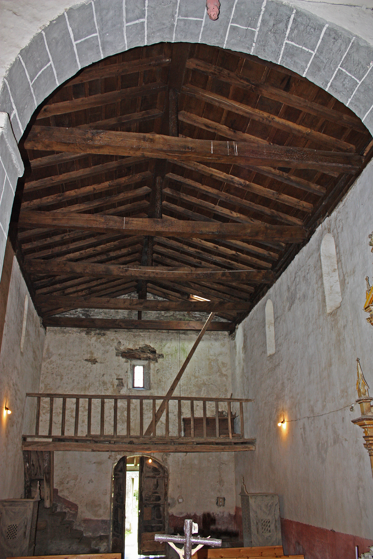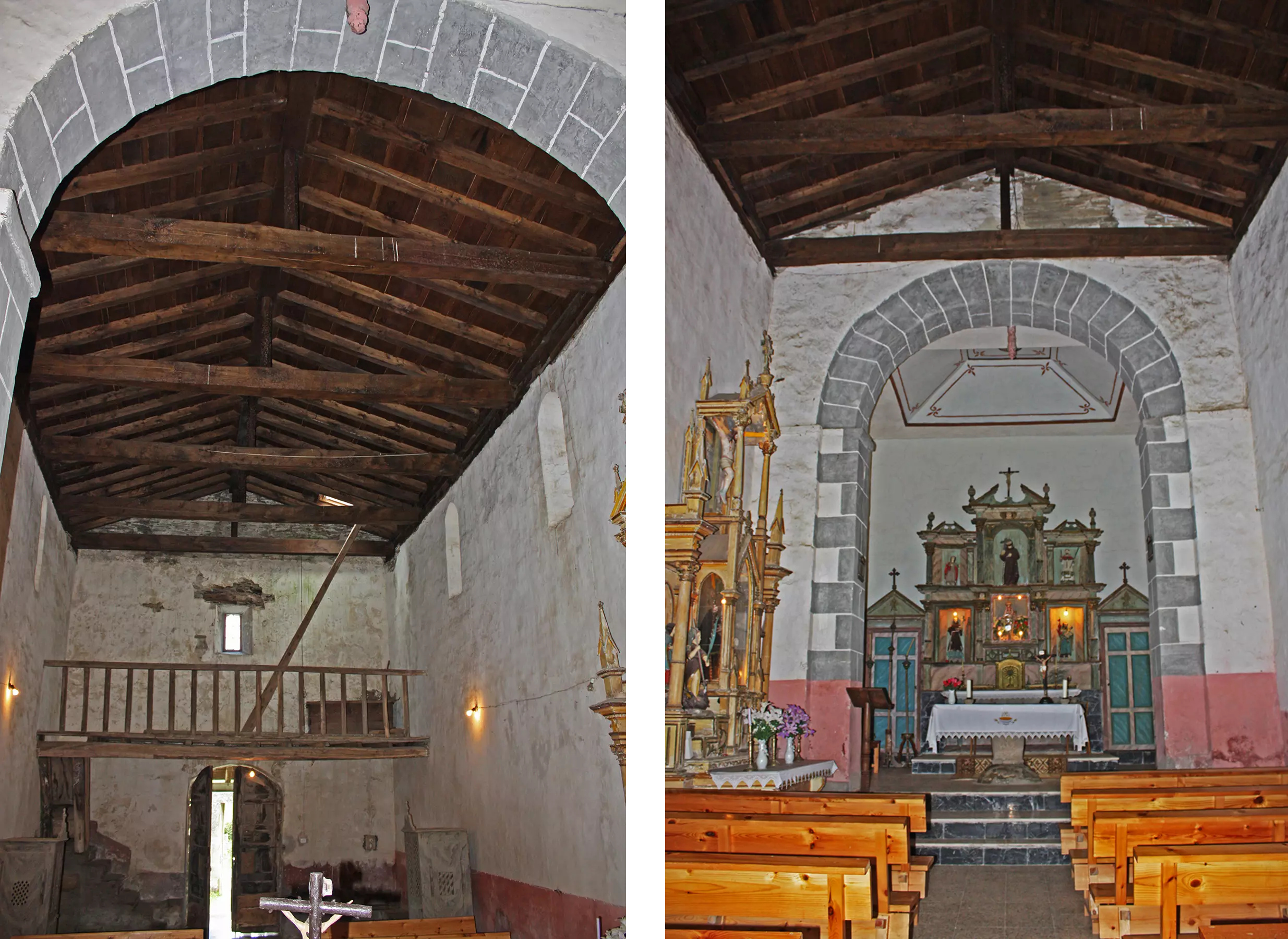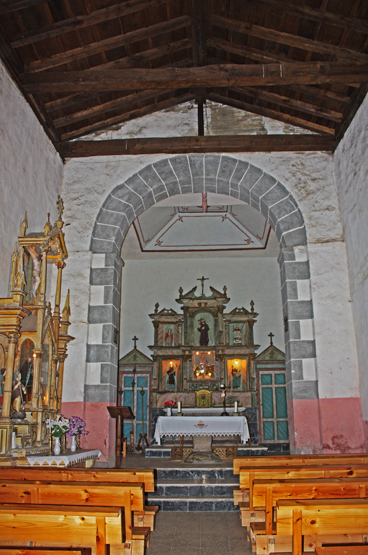 En el interior, la nave conserva gran parte de su primitiva fábrica románica. Cuenta con un coro alto de madera a los pies, dándose el encuentro entre la cabecera y la nave a través de un arco triunfal de medio punto. El presbiterio se eleva sobre una triple altura y acoge tras de sí el ábside presidido por un retablo que, a su vez, está flanqueado por sendas puertas que significan el acceso a la sacristía. Estas son adinteladas y simulan sobre ellas un frontón triangular coronado por una cruz en su vértice superior. Este espacio está cubierto con falsa bóveda de yeso que simula casetones a través del color.