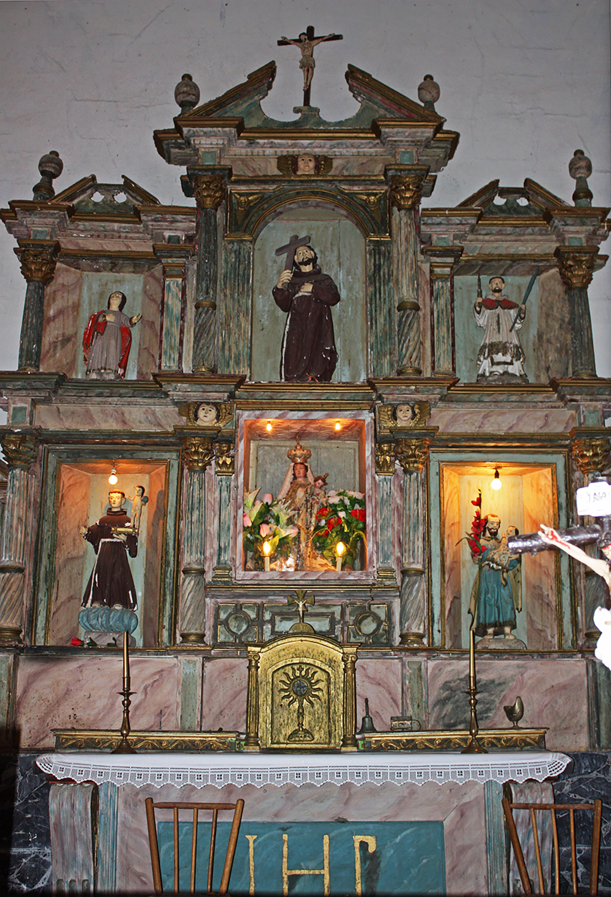 El retablo mayor forma un conjunto de estilo clasicista datado en el siglo XIX fabricado en madera y policromado. Esta, técnica con la que se busca dar nobleza al material original simulando así el veteado del mármol en los elementos estructurales como los paneles del sotabanco y los parteluces y entrecalles que ordenan verticalmente el conjunto. Se trata de dos pisos con tres calles que generan espacios propios, todos adintelados excepto el central del piso superior, para ubicar parte del repertorio iconográfico de la iglesia. Estas hornacinas acogen a: la Virgen coronada sosteniendo al Niño Jesús en el brazo derecho san Francisco, santa Lucía, san Ramón Nonato, San Antonio y San José, todas ellas del gusto popular y de distintas procedencias. Sobre el altar que se encuentra ante este retablo hay un cristo crucificado. La mesa del altar aprovecha en el pie dos piezas de granito que parecen corresponder a una antigua columna y a una pila que se ha colocado como base.