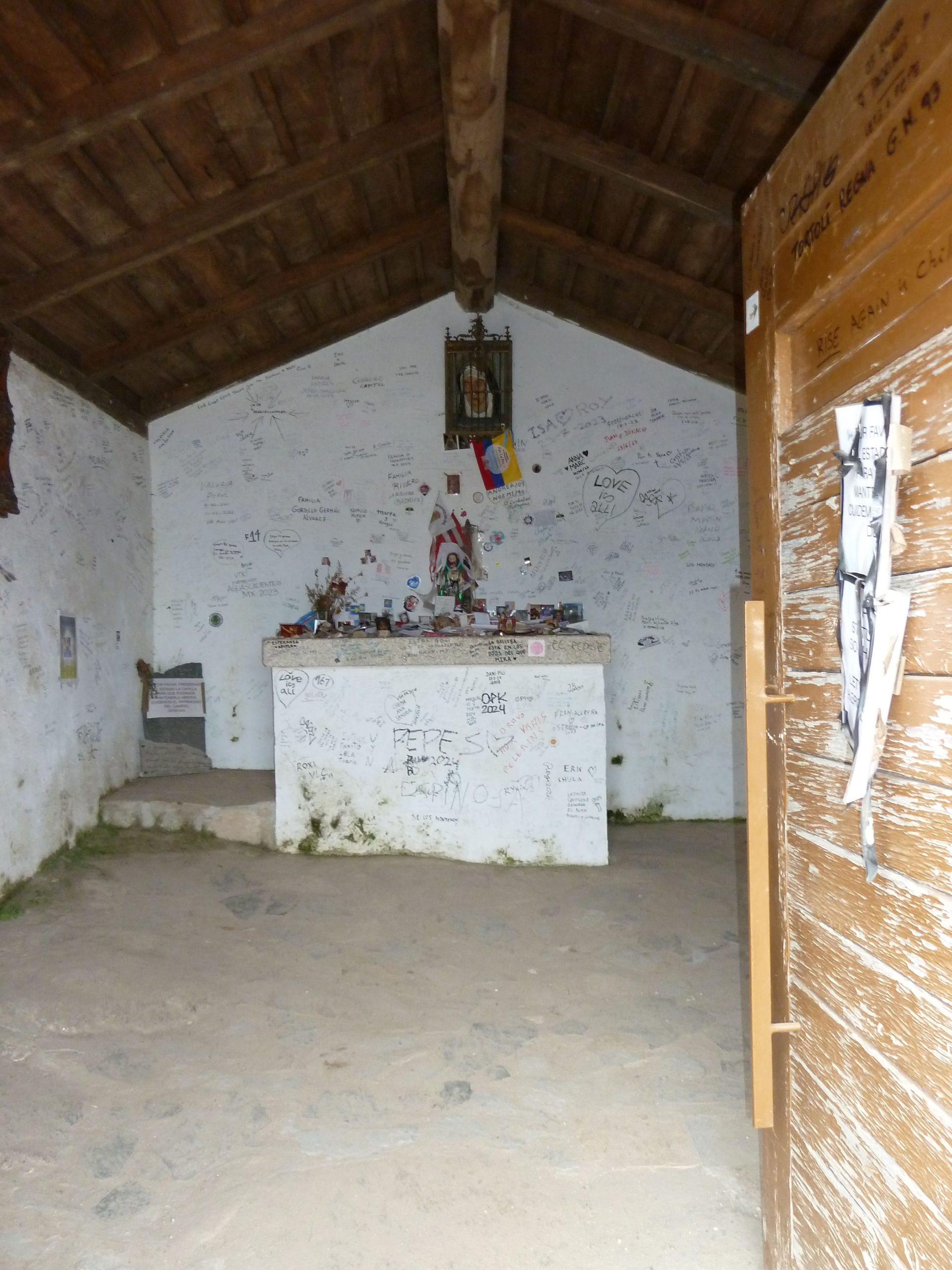 El interior tan solo conserva la mesa de altar, de hormigón y granito, pero está liberada de cualquier imagen, salvo de una pequeña tabla pintada de la santa patrona de la iglesia que preside el templo.