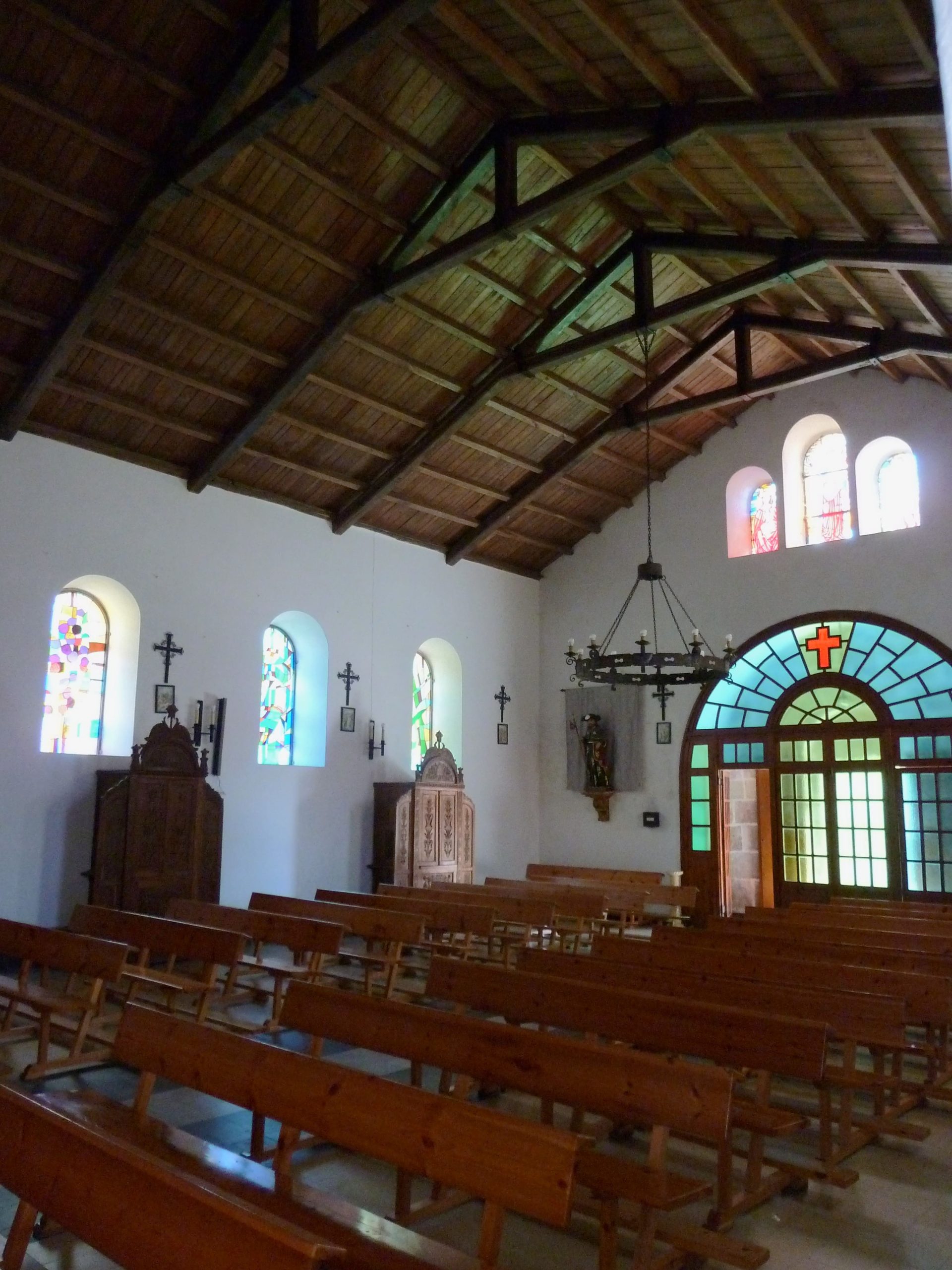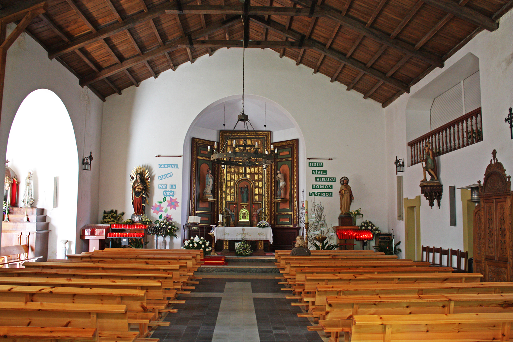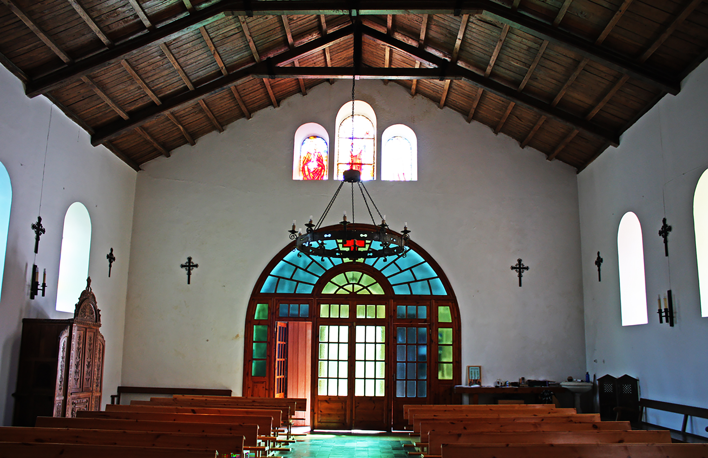 La nave, de planta rectangular, cuenta con múltiples vanos de iluminación tamizados por el color de las vidrieras que ocupan ambos muros laterales llegando hasta el ábside, también en la capilla anexa. El ábside se eleva sobre la línea de cota por una doble plataforma. La nave principal está conectada con la capilla en el lado del Evangelio mediante un arco de medio punto de amplia luz. A través del lado opuesto, el de la Epístola, es posible acceder a una pequeña tribuna en el primer piso, cerrada al exterior por una barandilla de madera. Asimismo, en la cota inferior, la nave se comunica con la torre del campanario.