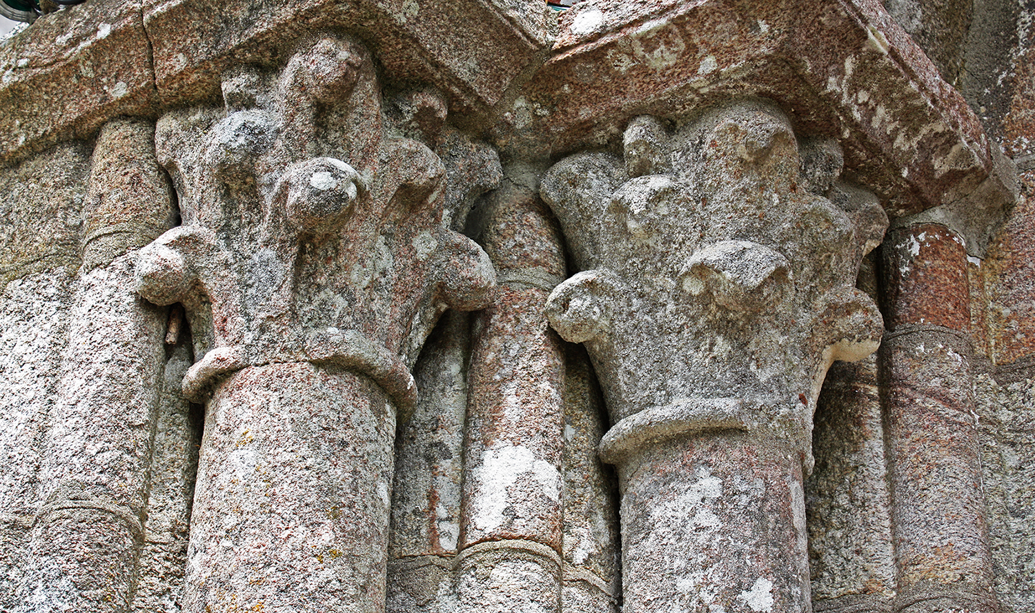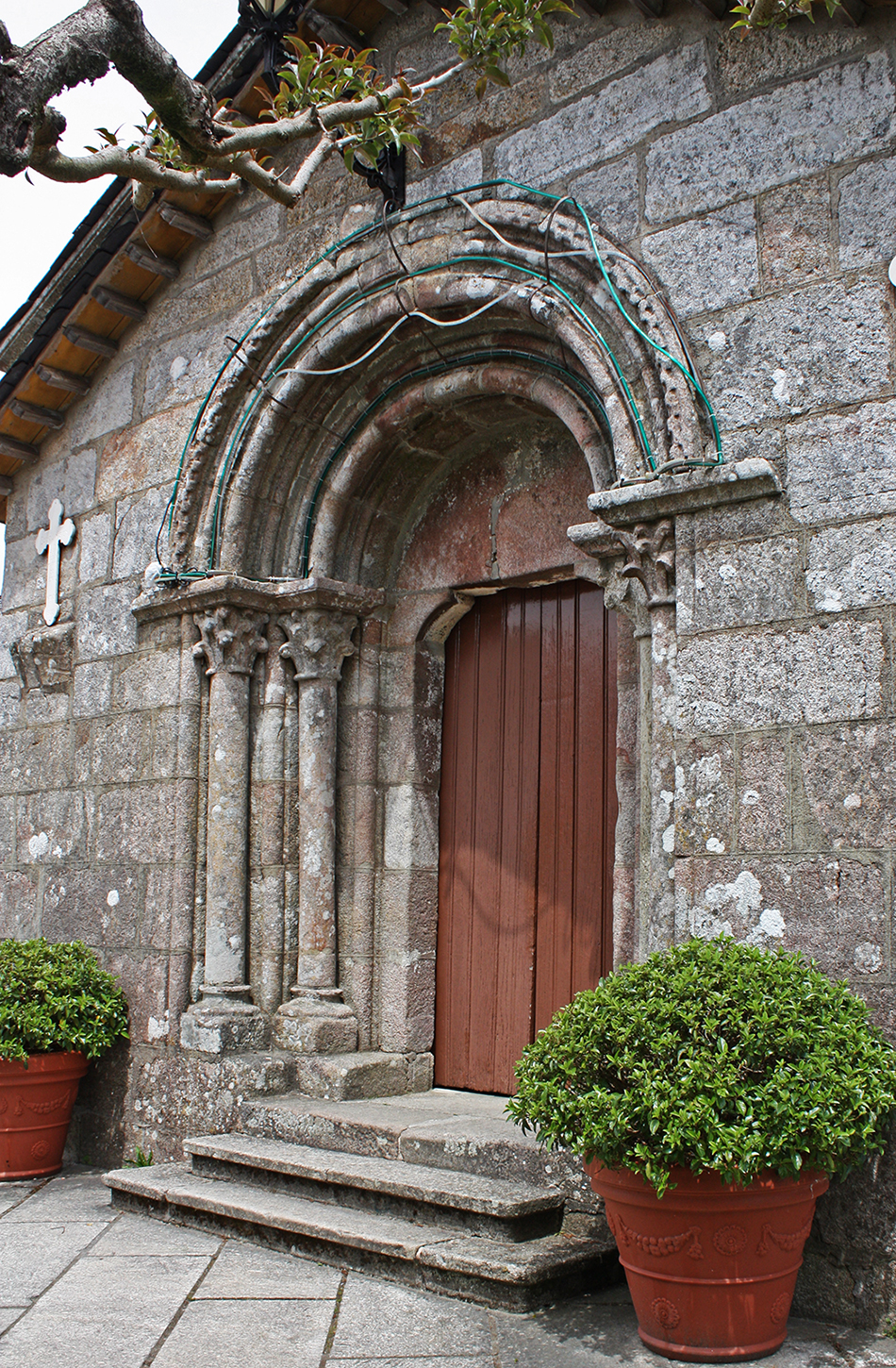 Los restos románicos de la portada configuran una fachada antecedida de cuerpo, un volumen saliente a media altura con cubierta a dos aguas y escalinata central que da paso al cuerpo de la nave principal. En él se ubica la portada formada por la cuádruple arquivolta, de tal forma que genera volúmenes entrantes y salientes con un amplio dinamismo. La primera y tercera vuelta de arco se sostienen sobre columnas de fuste circular acodilladas al muro, mientras que la segunda y cuarta vuelta lo hacen sobre pilares idénticos exentos sobre una basa. Los capiteles corintios que los encabezan reciben la imposta moldurada en la que rematan los arcos. La rosca de estos arcos se presenta en bocel en aquellos interiores, mientras los salientes exageran esta misma forma doblando su volumen. El conjunto está rematado por una chambrana con dibujo ajedrezado.