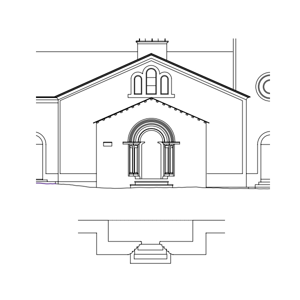 Alzado frontal. (José Antonio Franco Taboada, Santiago Tarrío Carrodeguas (dirs.), A arquitectura do Camiño de Santiago: descrición gráfica do Camiño Francés en Galicia, Santiago [de Compostela], Xunta de Galicia, A Coruña, Universidade da Coruña, D.L. 2000).