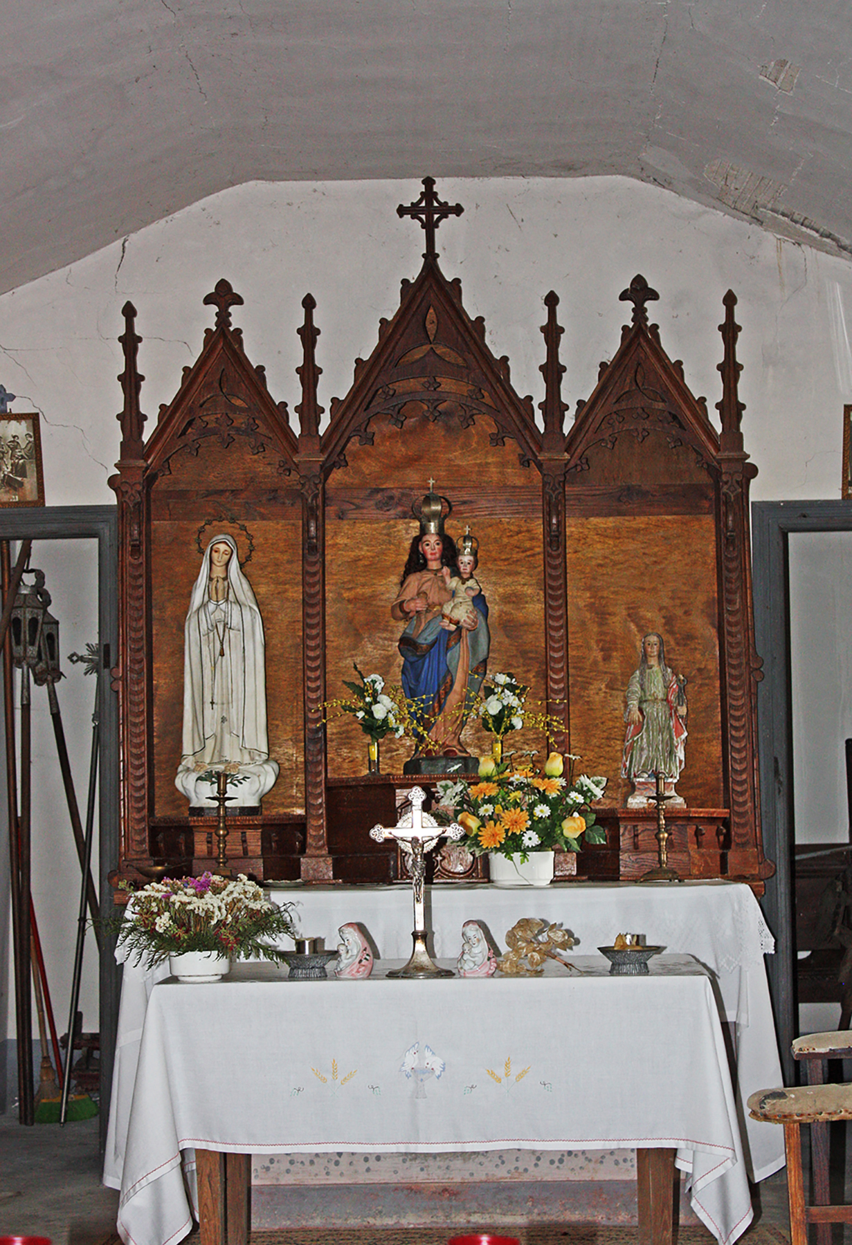 En el interior, la capilla conserva el retablo de estilo neogótico, una estructura de tres calles verticales sobre un sotabanco de madera. Cada una de las calles se prolonga en pináculos estilizados y tracerías rematados en cruces. En la calle central está ubicada la Virgen con el Niño en brazos, flanqueada por Santa Apolonia y la Virgen de Fátima.