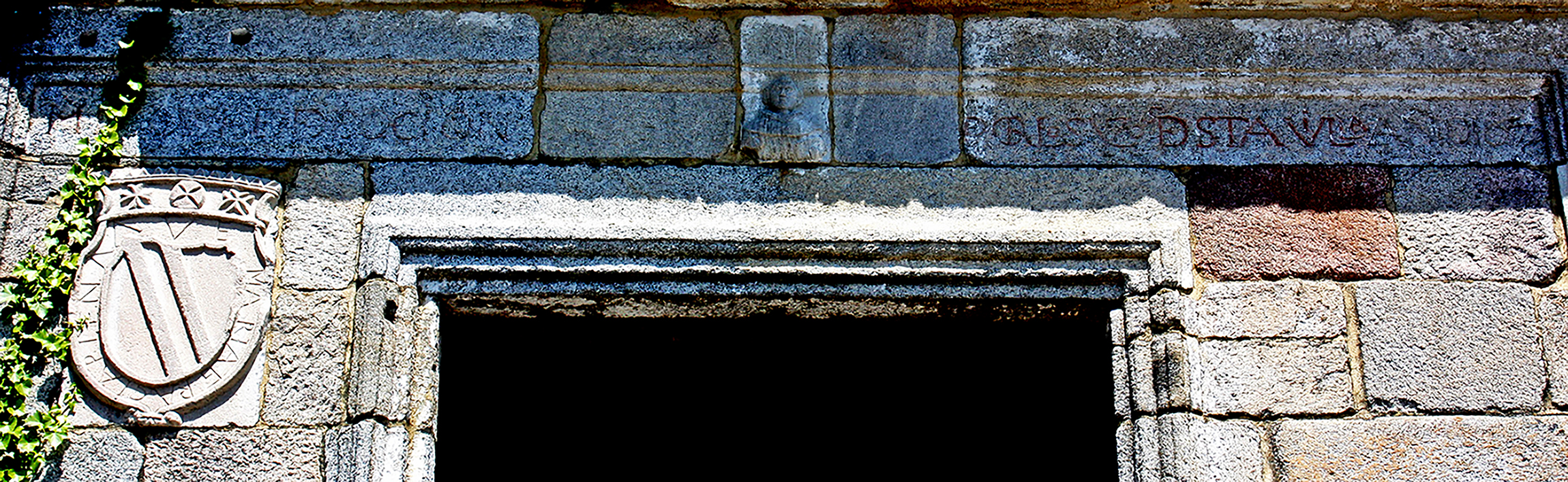 | Detalle del escudo e inscripción en la fachada de la capilla. |
