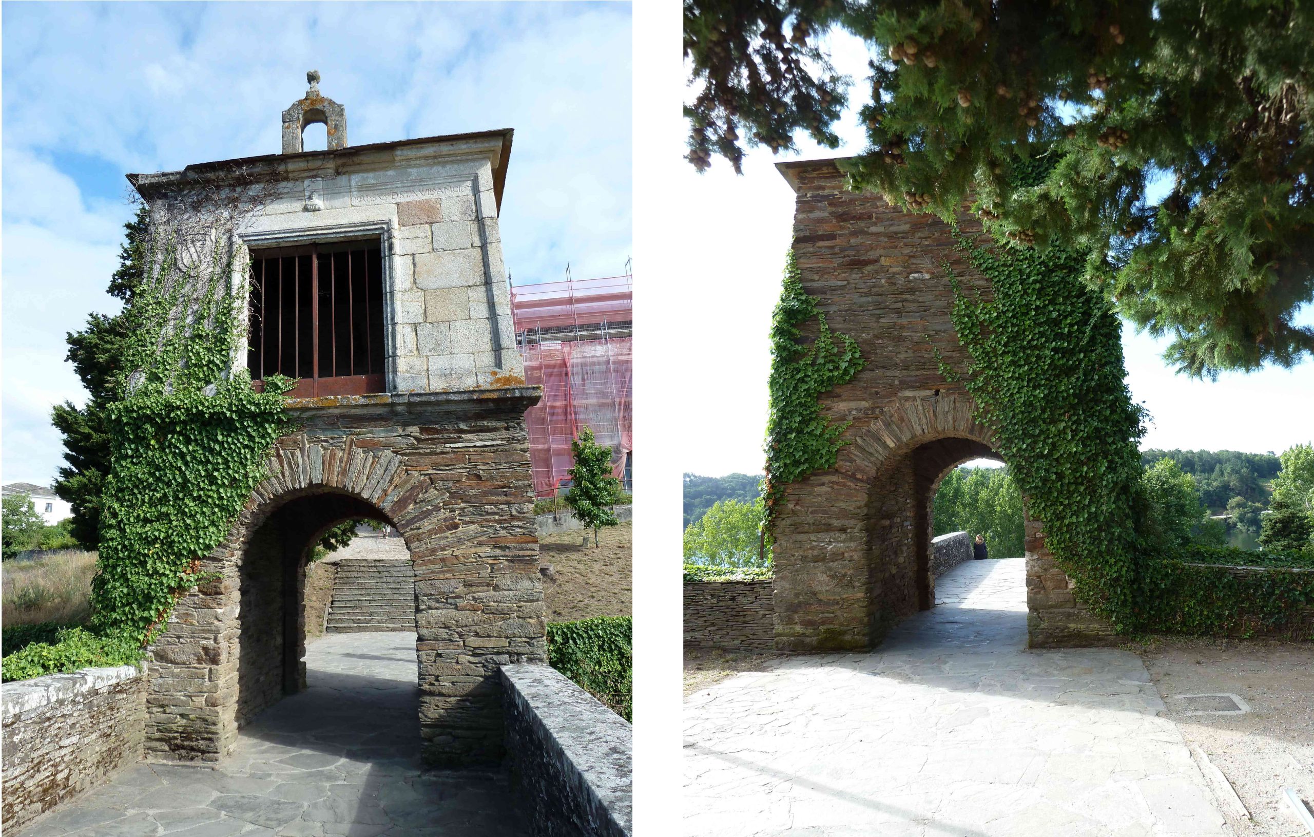 Se trata de un cuerpo prismático cuya fachada está enmarcada por baquetones y rematada por una cornisa en voladizo que sostiene la cubierta de pizarra del edificio. En esta fachada se horada un vano rectangular, actualmente cerrado por un enrejado de acero corten, donde a la izquierda de este se ubica el escudo tallado en piedra con dos barras diagonales, similar al ubicado en el exterior de la antigua sacristía perteneciente a la iglesia de San Nicolao, que hacía referencia al comendador de Portomarín, Juan González de Mendoza, quien promovió la obra de la edificación en el año 1619.