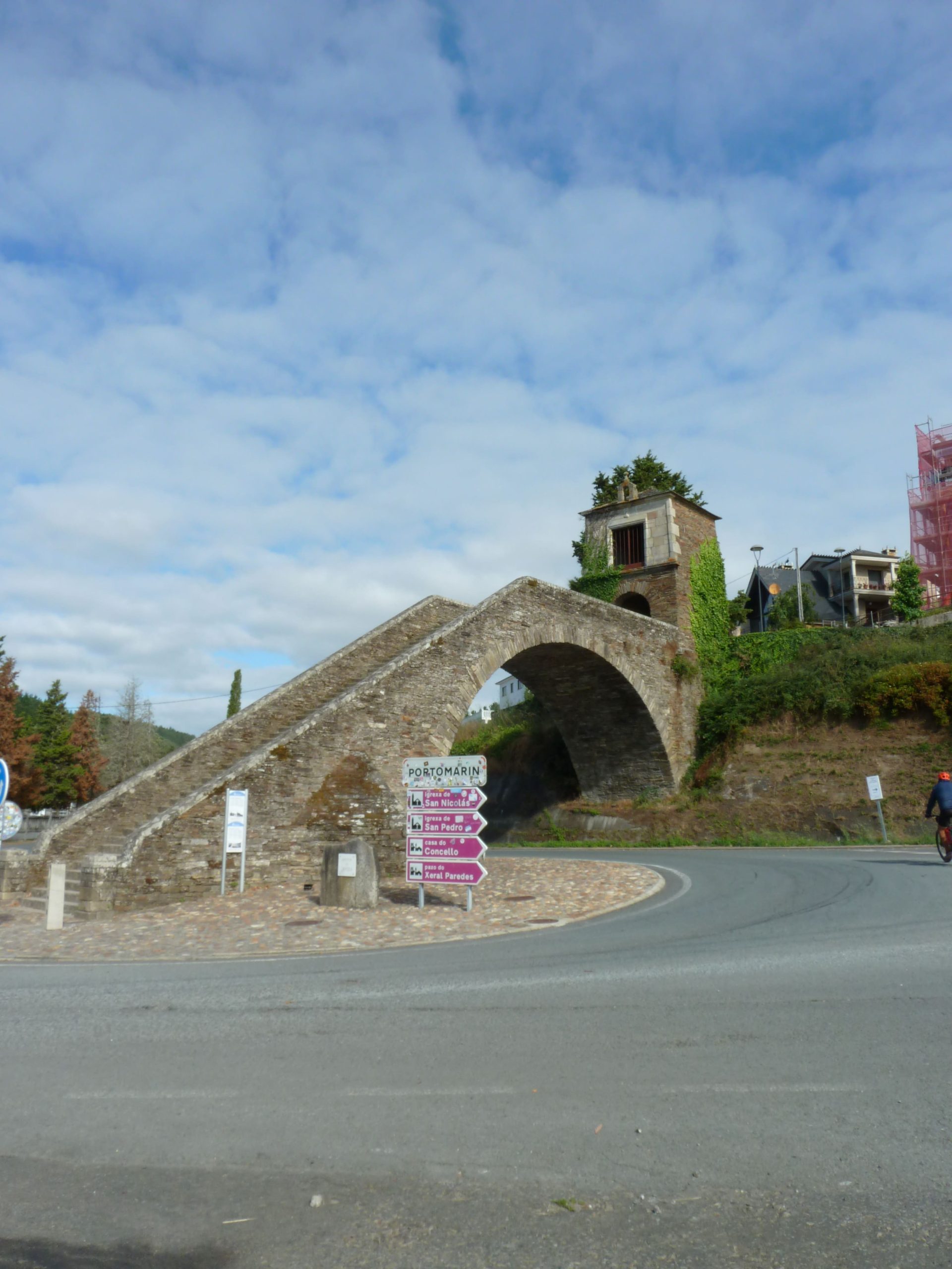 Hoy en día, siguiendo el Camino Francés desde el lugar de San Pedro, se accede al Portomarín nuevo por un gran viaducto de hormigón que cruza el embalse hasta llegar al pie mismo de la población, donde se reubicó el último arco del puente medieval con su tajamar y los restos de la torre con la capilla dedicada a la Virgen; sobre el estribo del arco se hizo una escalinata por la que se accede al centro urbano.