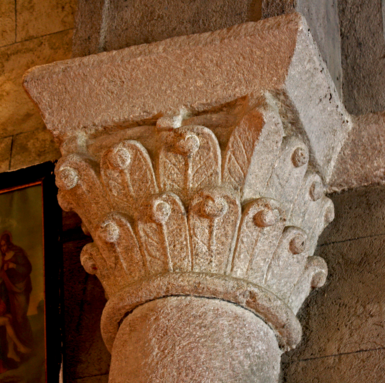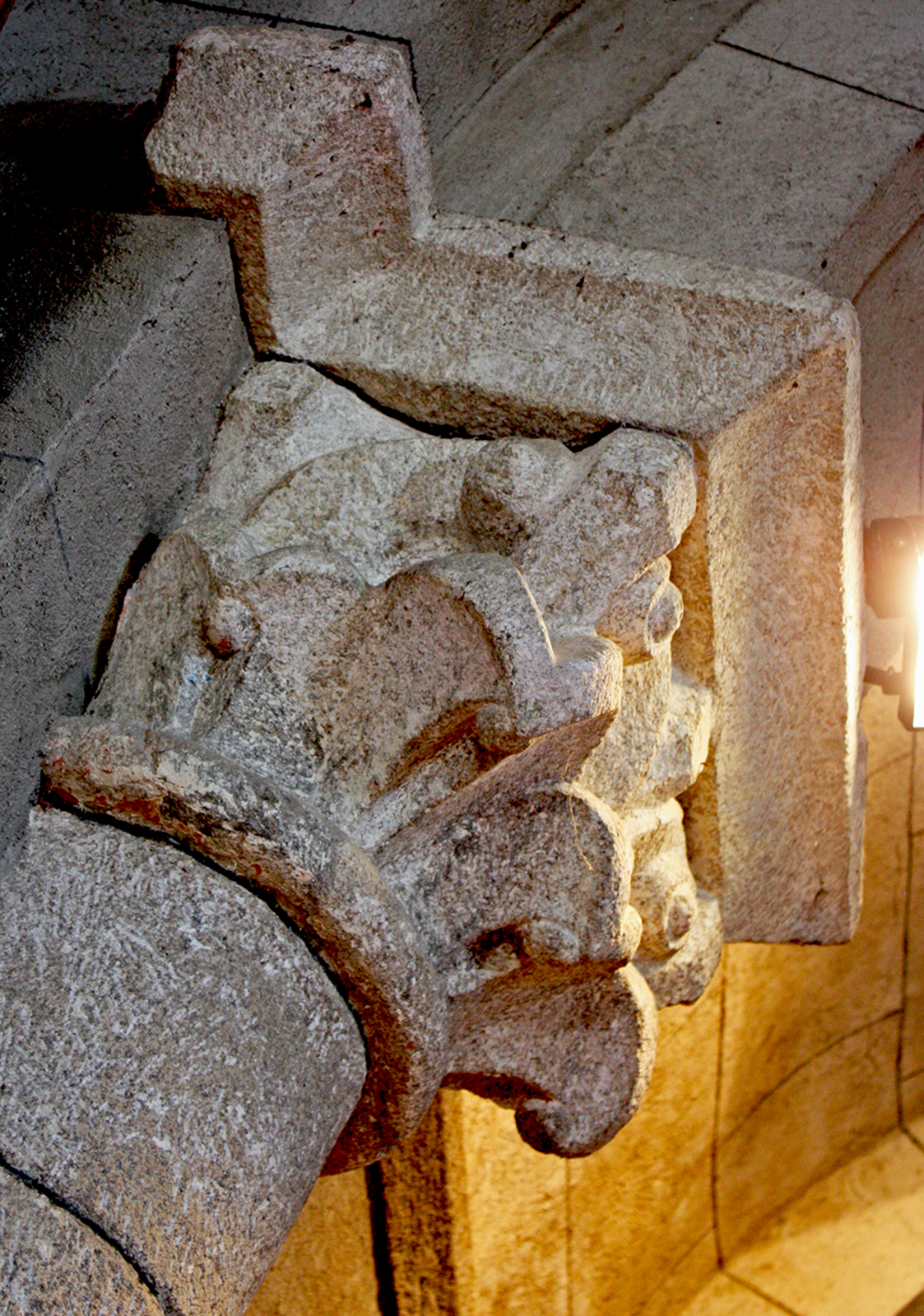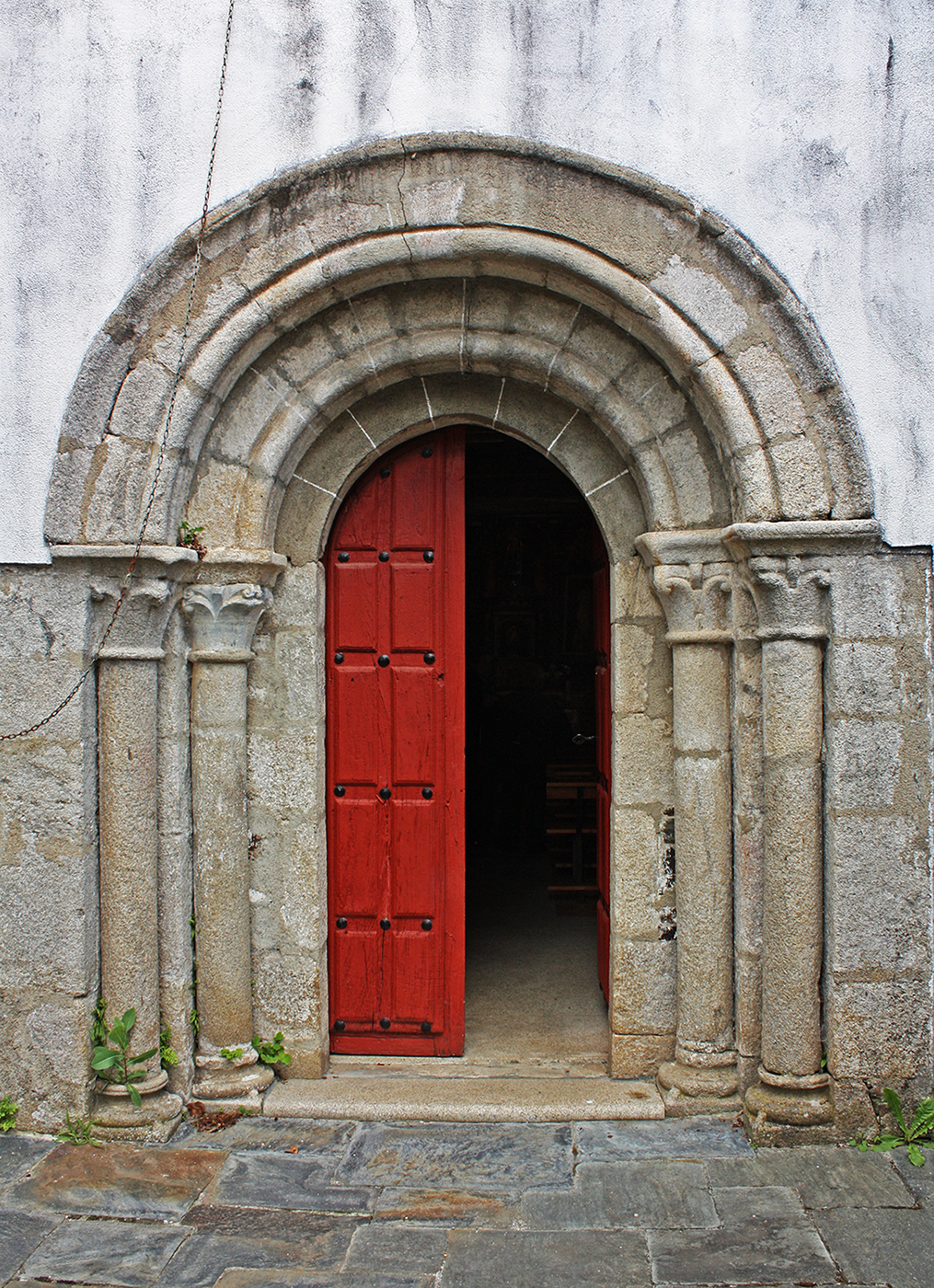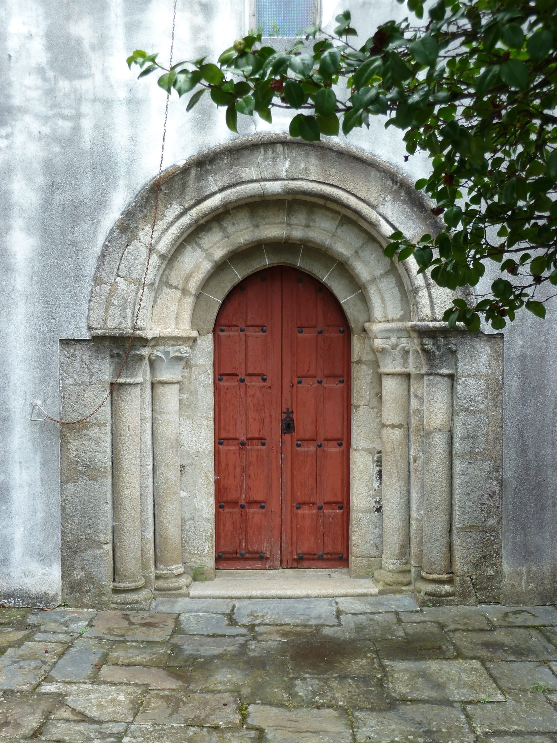 La portada románica está formada por un arco de medio punto —cuyo tímpano se ha perdido— enmarcado por dos arquivoltas que siguen la misma forma. Los arcos de estas descargan sobre cimacios moldurados acogidos por capiteles ornamentados con hojas de acanto poco trabajadas, en algunas partes diluidas debido a la erosión. Entre ellas se aprecia una diferencia de material; mientras que el interior del lado derecho se construyó en mármol, los restantes son de granito. Este conjunto forma parte de las columnas de fuste liso y basa ática acodilladas al muro en ambas vueltas.