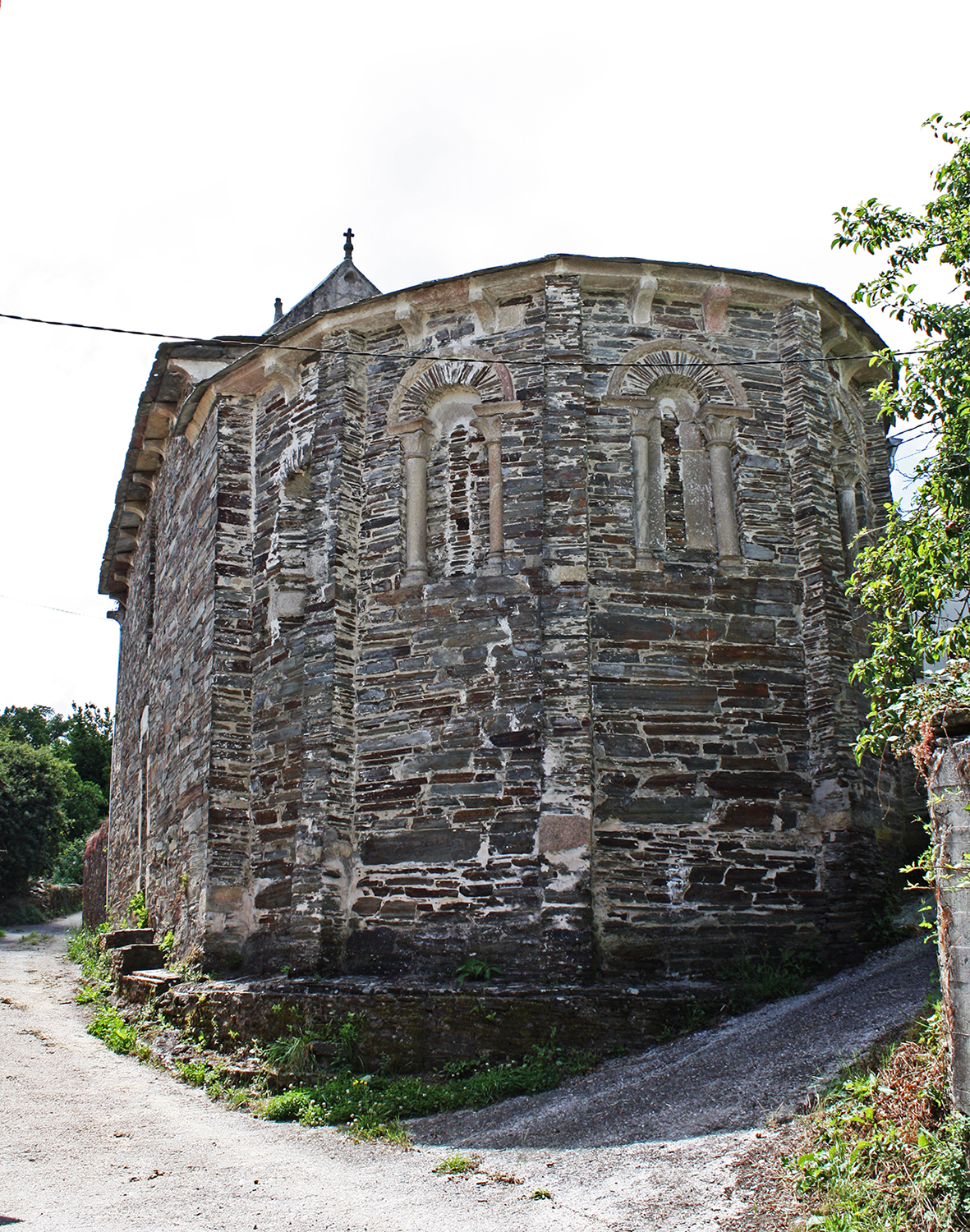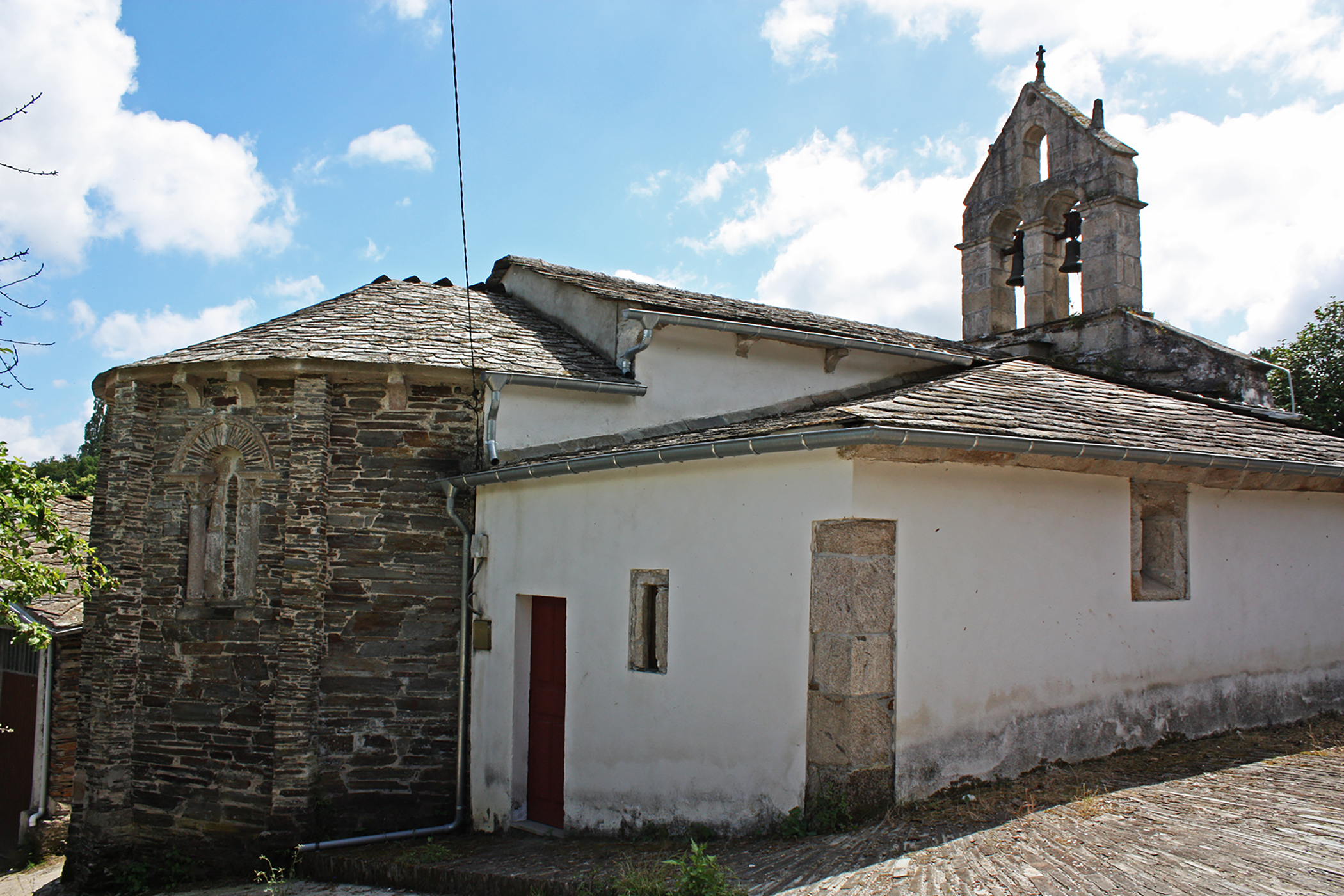 El muro sur cuenta con un acceso secundario y un vano en el segundo registro para la iluminación interior de la nave. Mientras, el muro norte está protagonizado por el cuerpo correspondiente a la sacristía, que cuenta con un acceso propio en el lado este y también vanos para la iluminación del interior. Singular es el ábside que cuenta con un tramo recto y uno semicircular. Este, dividido en tramos por contrafuertes, cuenta con, ahora, vanos tapiados que en origen fueron saeteras enmarcadas por un arco de medio punto sobre columnillas adosadas al muro de sección circular, base ática y capitel con decorado con hojas de acanto. En el encuentro entre estos lienzos y la moldura de la cubierta, al igual que en los muros laterales de la nave, se resuelve con canecillos lisos. Las cubiertas son de pizarra y siguen el esquema a dos aguas en la nave longitudinal, a tres aguas en el volumen de la sacristía y el porche y de forma poligonal en la cabecera.