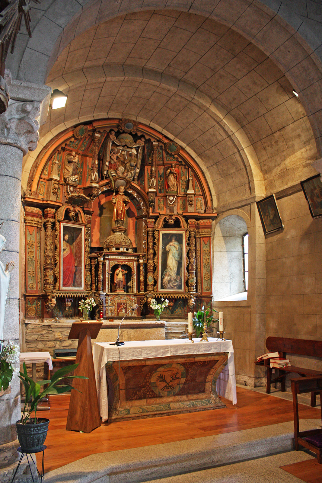 El retablo mayor es de madera policromada de estilo barroco que, según Valiña Sampedro, data del siglo XIX. Se trata de un conjunto adaptado al espacio que ocupa, profusamente decorado, desde la policromía utilizada hasta las formas ornamentales que cubre sus elementos desde el banco hasta el ático. Está formado por tres calles verticales en un solo piso donde resalta el Sagrario con forma de templete, cuajado de decoración. Las hornacinas de las calles laterales están enmarcadas por entrecalles y guardapolvos ornamentados con estilizaciones vegetales, roleos, volutas y veneras de dorados que impactan con la luz resaltando así el conjunto. Las guirnaldas y medallones recorren la superficie de los laterales del retablo y las superficies planas, respectivamente.