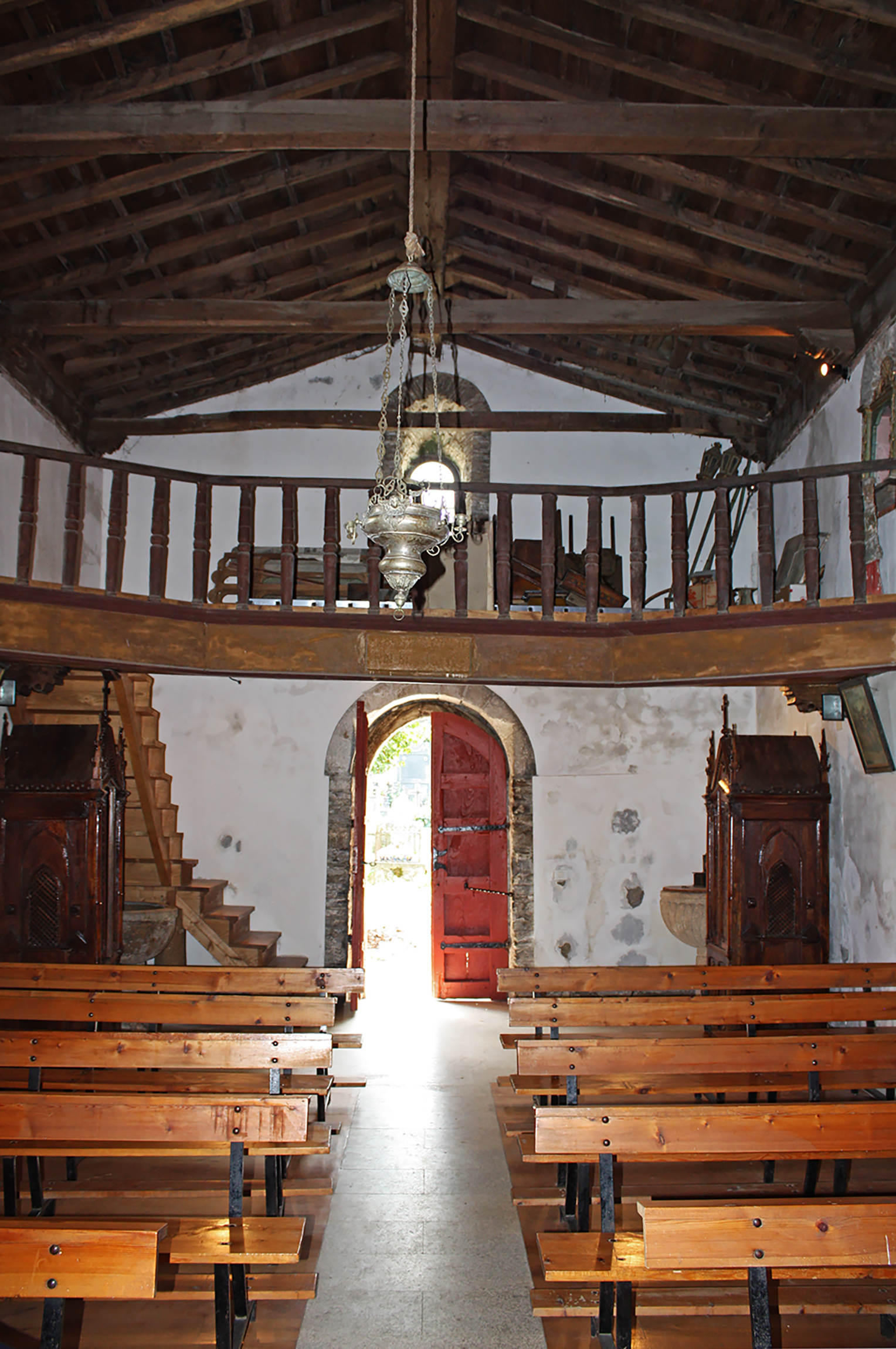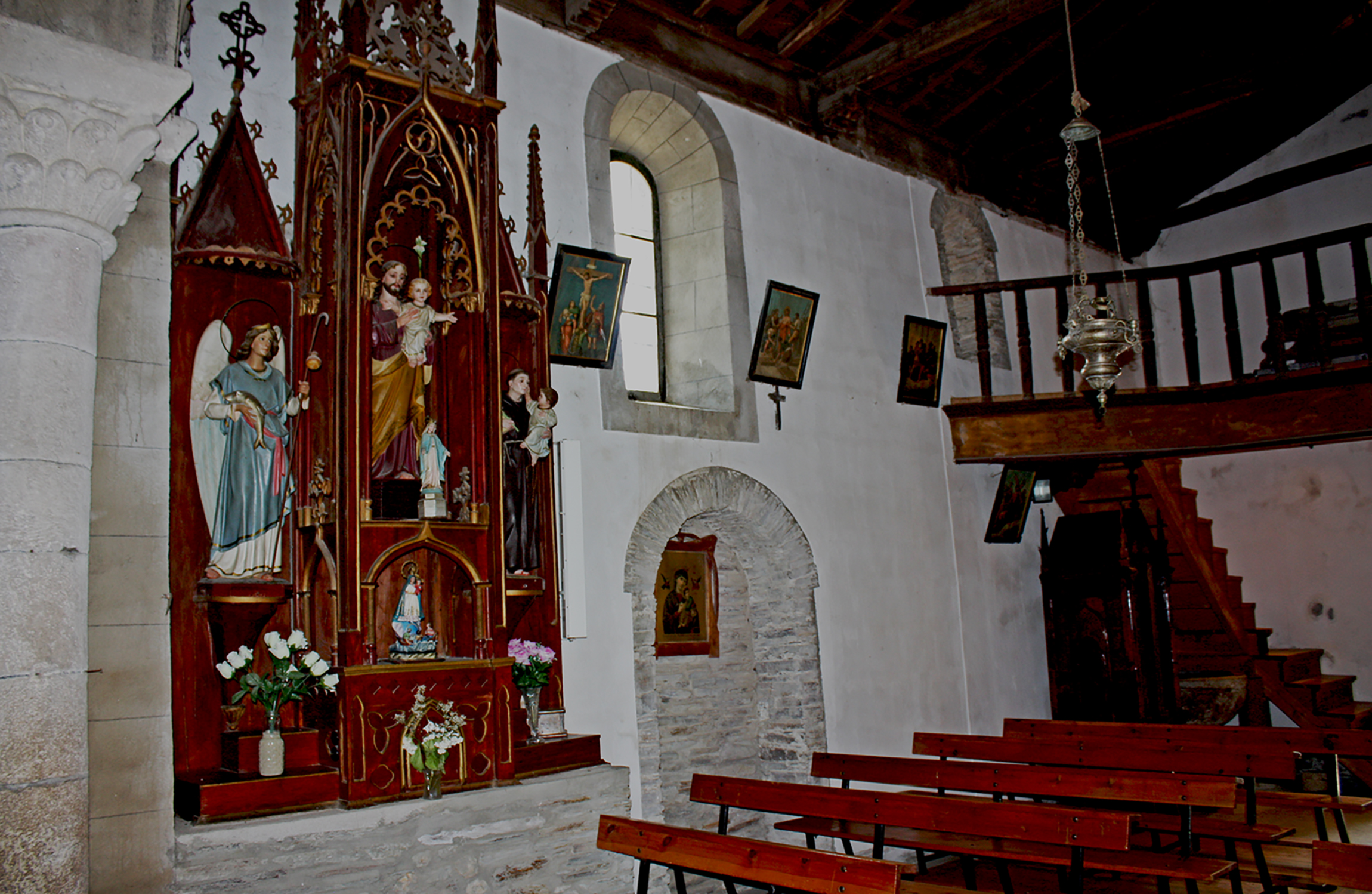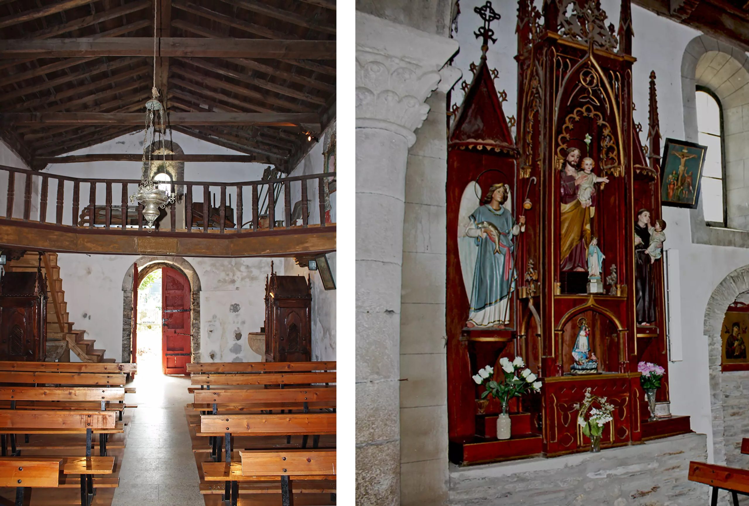 En el interior, cuenta con coro alto a los pies de la nave longitudinal, con acceso de madera a este en uno de los laterales y dos pilas bautismales dos pilas bautismales talladas en bloques monolíticos de granito —una de ellas tiene el cuenco semiesférico gallonado—, en el contrario. Las paredes están enlucidas y pintadas de blanco y reciben la luz del exterior a través de las ventanas descritas anteriormente. La techumbre mantiene a la vista la estructura de madera con vigas tirantes, reflejo exacto del exterior. En el muro del Evangelio se sitúa un retablo de madera en estilo neogótico del siglo XX con tres calles verticales, cuya estructura enmarca la central en una suerte de hornacina de planta rectangular sobre el Sagrario. En ella, la imagen de San José con el Niño, flanqueada a la derecha por San Antonio y, a la izquierda, por San Rafael. El tránsito entre la nave y el presbiterio se resuelve con un arco de gran luz de tipo triunfal y medio punto, reconstruido, al igual que la casi totalidad de la cabecera, de forma reciente, aunque manteniendo las columnas sobre las que descarga tal arco, que todavía conservan leves restos de la policromía original. Estas columnas son de fuste circular, base ática y capiteles de cuyo collarino arranca una doble corona de hojas superpuestas: en el lado izquierdo hojas de acanto con puntas enrolladas en forma de voluta y en la fila inferior adornadas con bolas en las puntas.