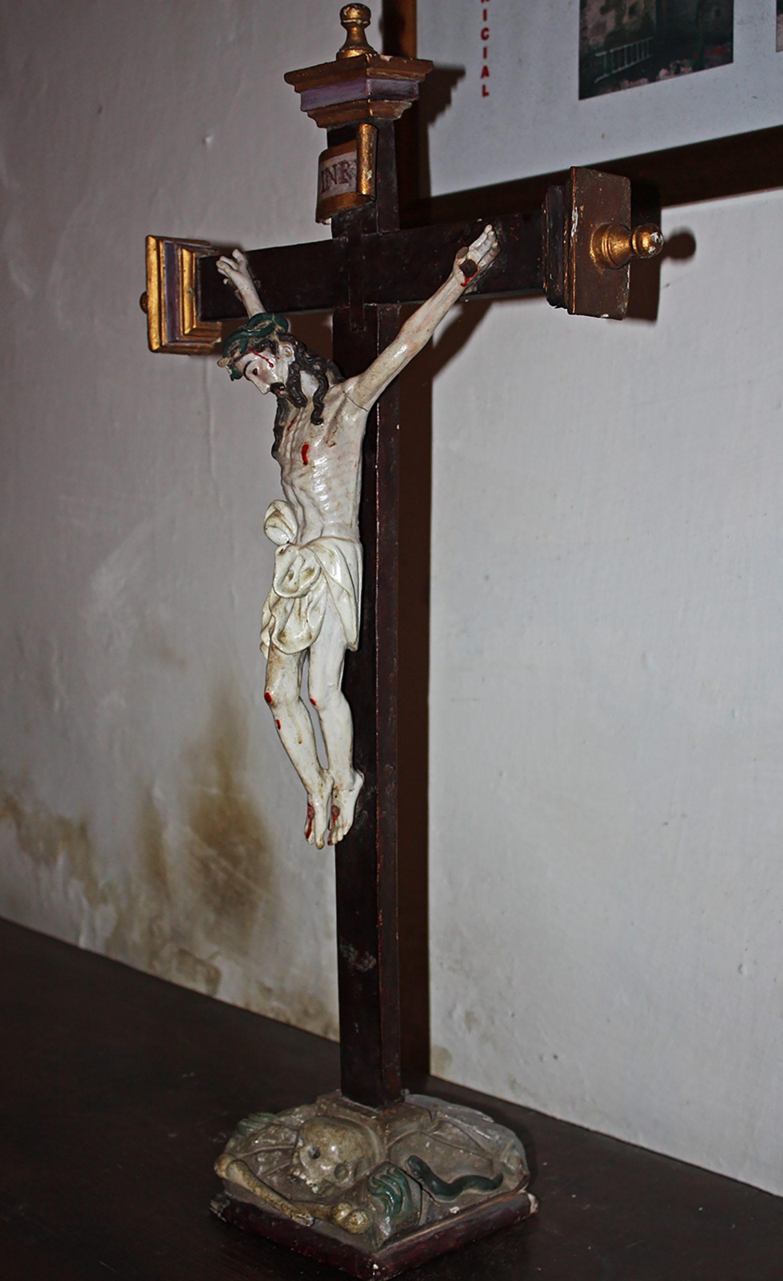 En la sacristía se encuentra una pieza de madera de significativa factura. Se trata de una cruz de madera con remates metálicos en los brazos.