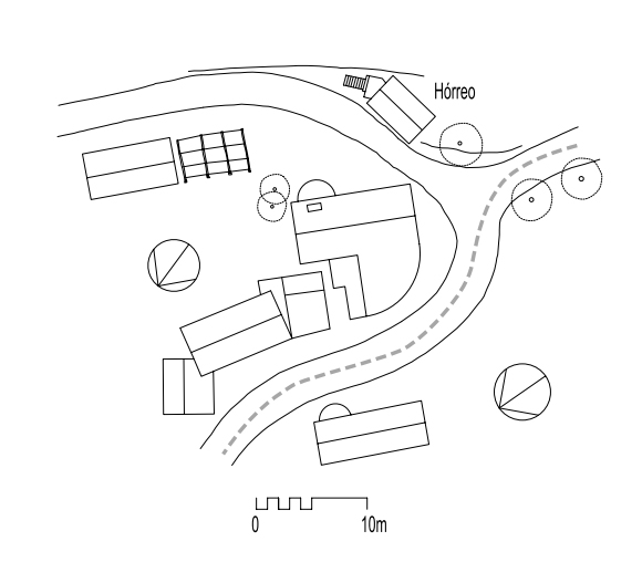 La población conserva varias casas de labradores con sus edificaciones anexas, construido todo al modo tradicional con piedra, madera y teja de procedencia local; destaca un hórreo con un cuerpo bajo cerrado por muro de mampostería que hace las veces de cillero y un cuerpo alto con armazón de piedra y paredes de tablas que dejan correr el aire, aunque en la parte contraria a la puerta la madera fue sustituida por ladrillo. El hórreo tiene escalera exterior en ángulo y cubierta de teja a dos aguas que sobrevuela la entrada de arriba protegiéndola de la lluvia.