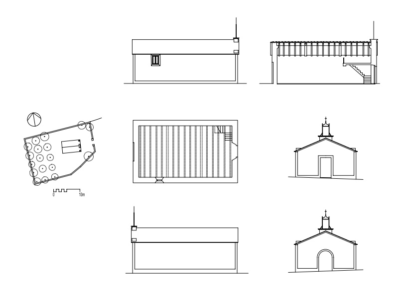 Emplazamiento, planta, alzados y secciones de la capilla.