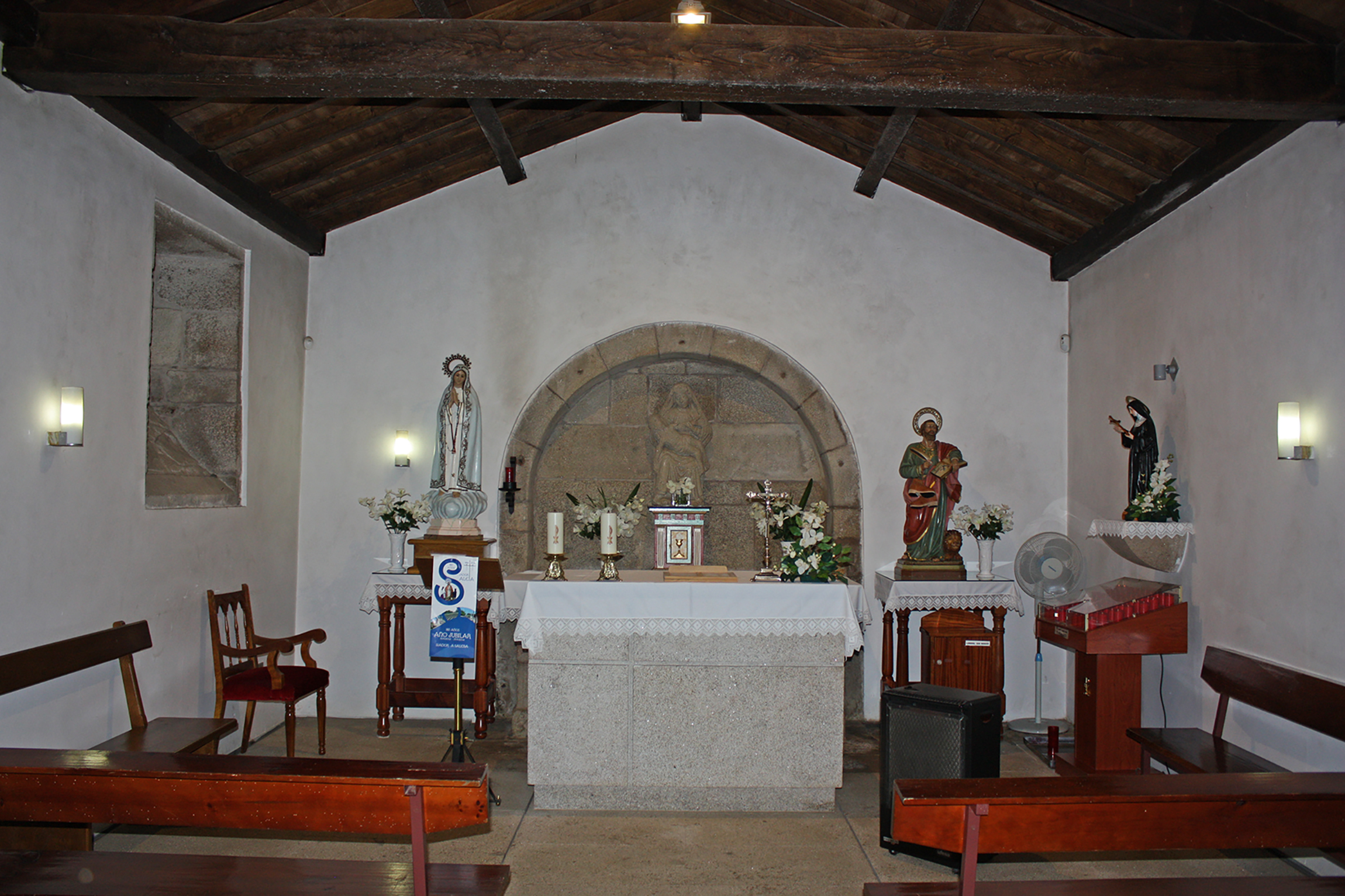 El interior de la capilla recibe luz a través de una única ventana adintelada con doble derrame, sita en el muro sur a la altura de la cabecera. En el muro testero se abre un arco de medio punto que hoy aparece tapiado. Bajo el arco se ha colocado el altar de la capilla, presidido por la talla en bulto redondo de una piedad labrada en piedra granítica. A la derecha del altar se encuentra una imagen de madera de factura reciente, que representa a san Marcos Evangelista; en el lado izquierdo se ha colocado la figura de la Virgen de Fátima. Por último, en el muro septentrional se encuentra la imagen de santa Rita apoyada sobre una peana.