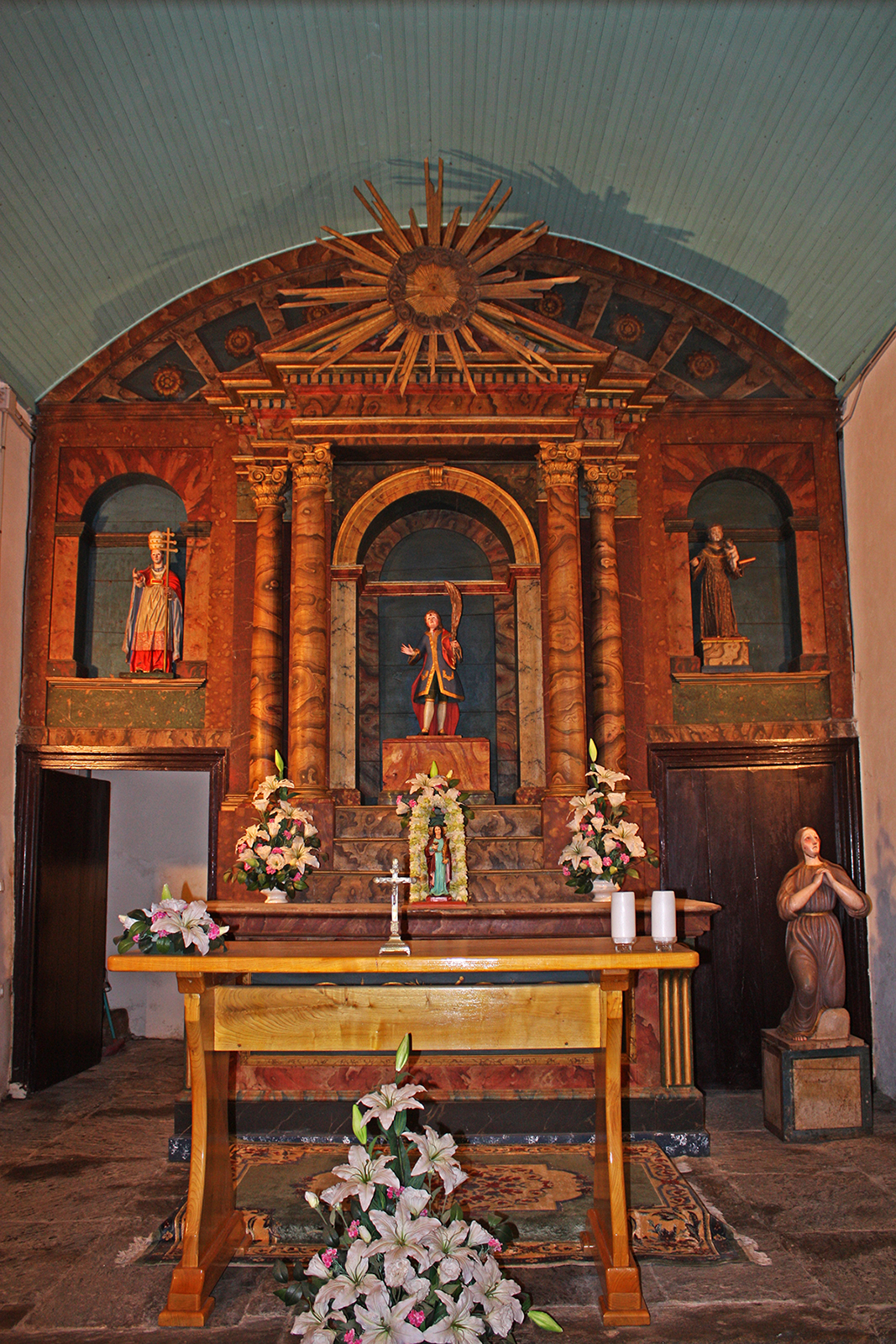 El retablo mayor es obra dieciochesca de estilo neoclásico, realizada en madera policromada que imita el veteado del mármol. Es parecido en su composición y estilo al retablo mayor de la iglesia da Lavacolla. Consta de un cuerpo bajo, un cuerpo principal y un ático. Los dos cuerpos están divididos en tres calles verticales, retranqueadas las laterales y adelantada hacia el espectador la calle central. El cuerpo bajo tiene a los lados dos puertas que comunican con la sacristía y en medio la mesa del altar con el sagrario encima. Tras el sagrario se encuentra un podio con tres pequeñas gradas que desembocan en la hornacina central del cuerpo principal, donde está colocada la imagen de san Paio. La hornacina se cubre con arco de medio punto y se encuentra flanqueada por dos pares de columnas de orden compuesto, situadas en dos planos distintos. Sobre la hornacina discurre un entablamento que soporta un frontón triangular; el frontón tiene en medio la representación del ojo divino inscrito en el triángulo que simboliza la Santísima Trinidad; está rodeado, a su vez, por un cúmulo de nubes del que emergen rayos de luz. En las calles laterales del cuerpo principal hay otras dos hornacinas con las imágenes de san Antonio con el Niño (a la derecha) y un santo en actitud de bendecir con el báculo y la tiara papal, que pudiera ser san Pedro (a la izquierda). El ático del retablo consiste en una rosca semicircular dividida en casetones cuadrangulares ornados con rosetones centrales.