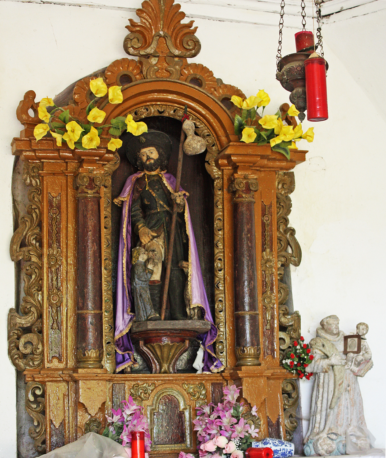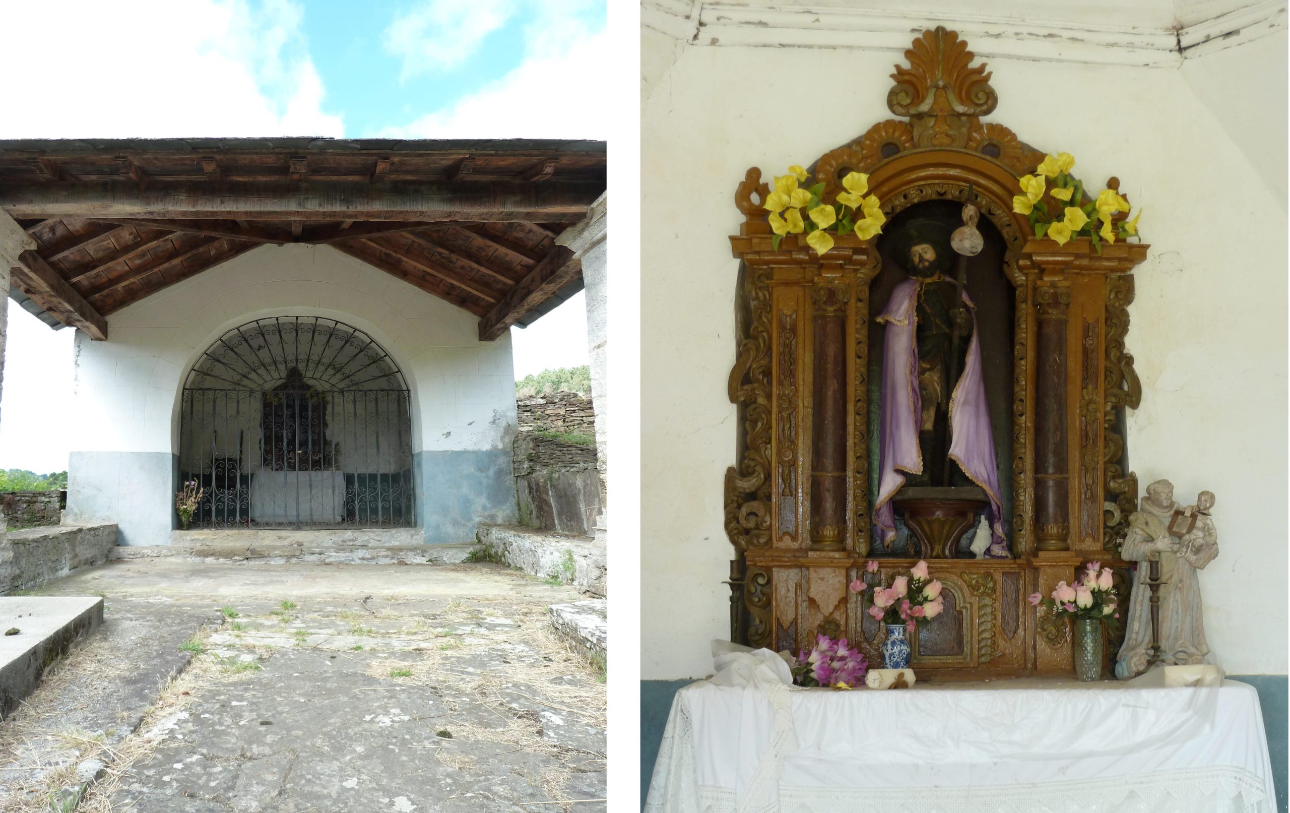 | Fachada principal de la capilla. Retablo de San Roque en el interior. |