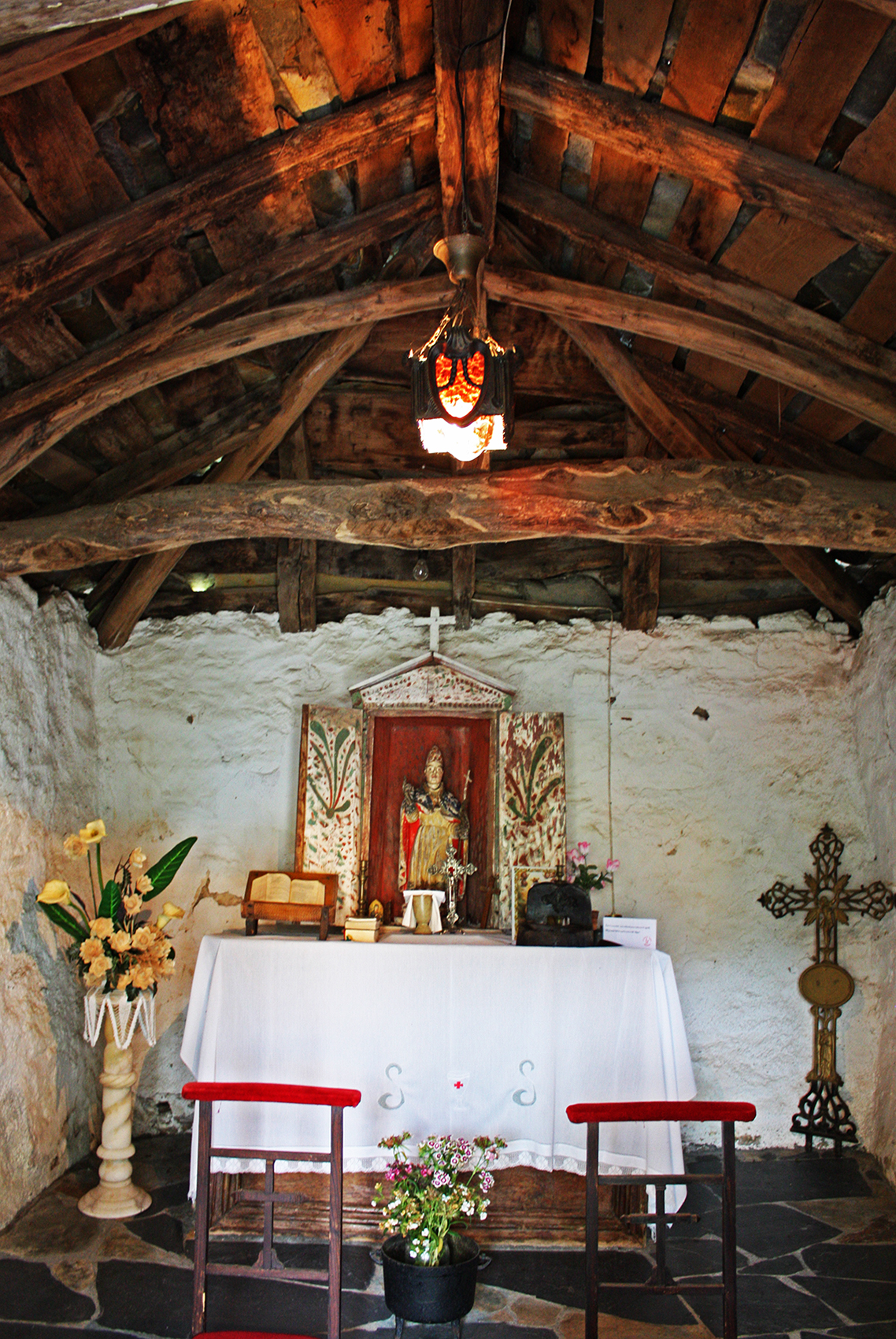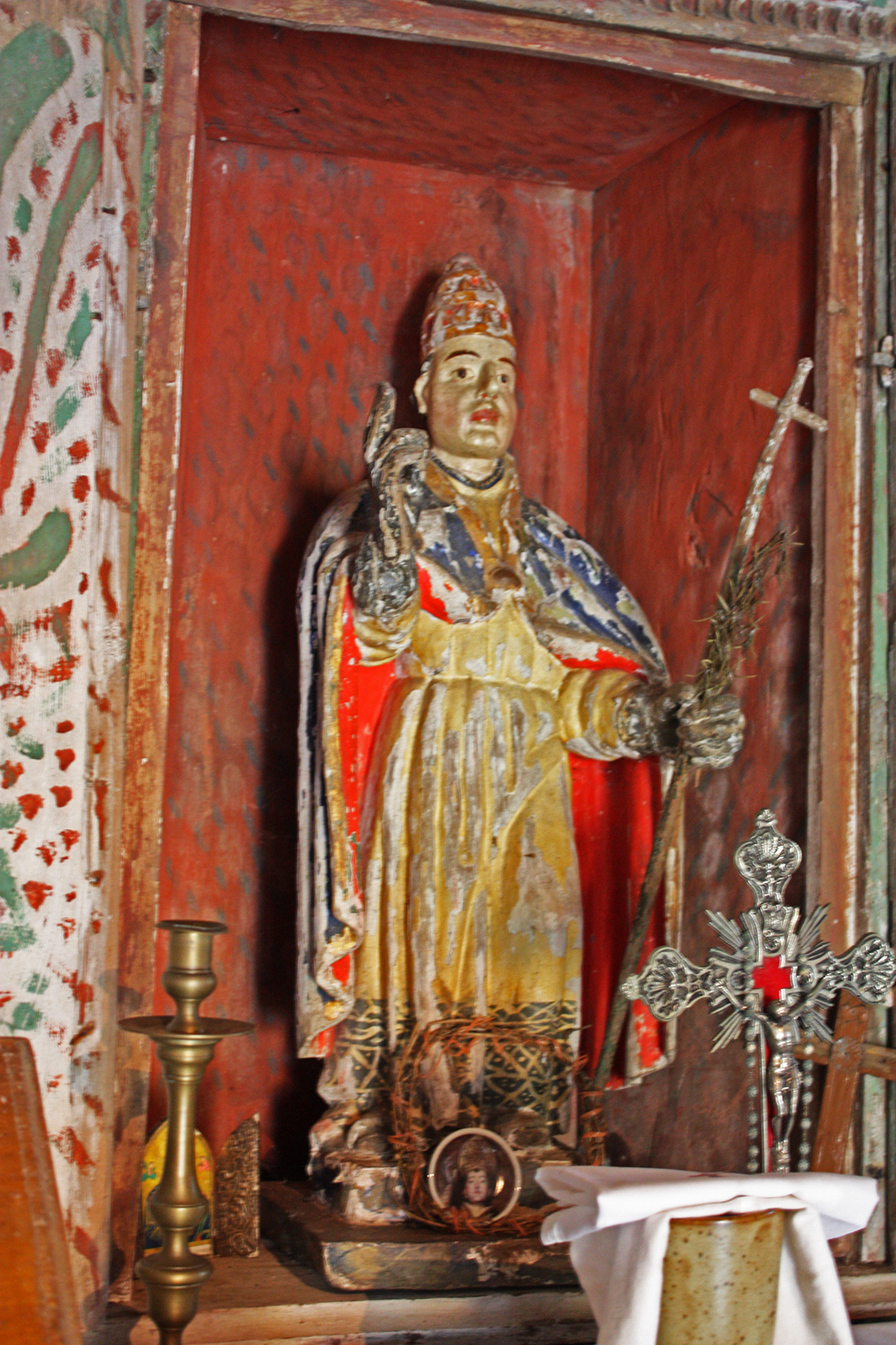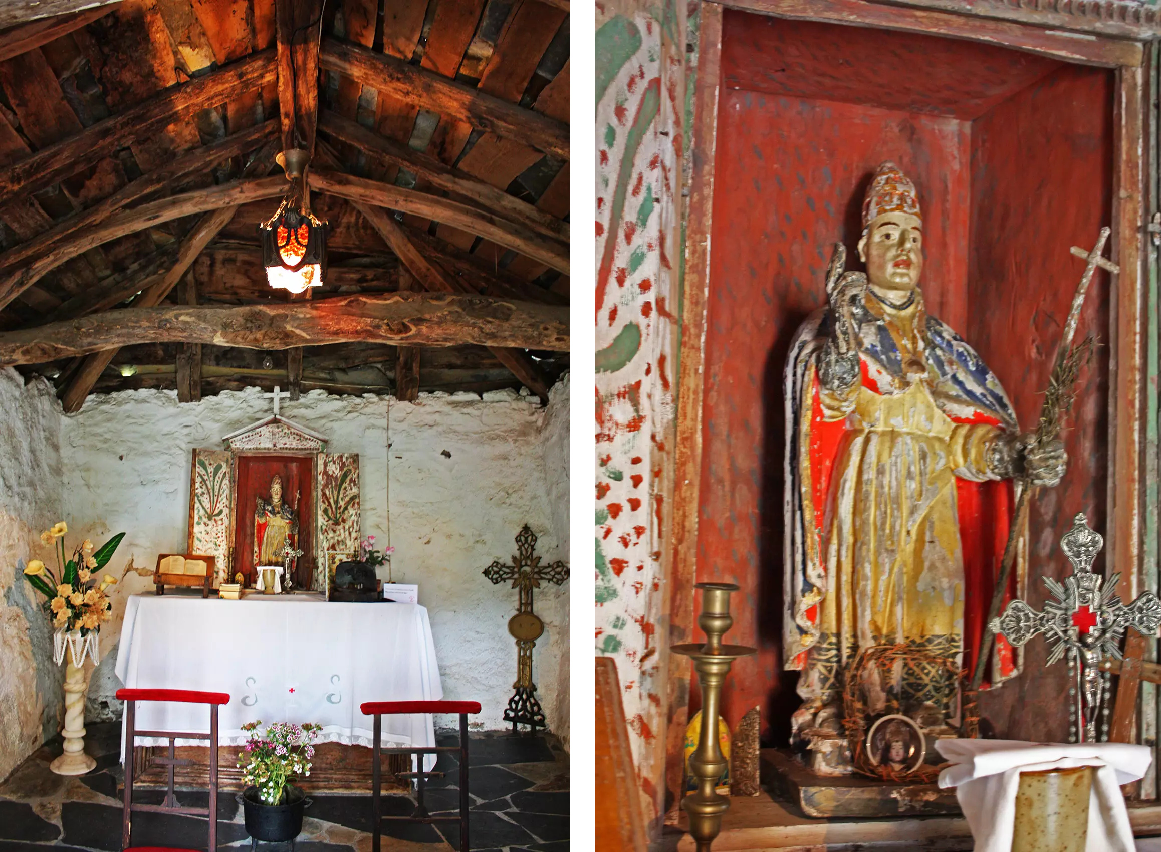 | Interior de la capilla de San Silvestre y retablo portátil (izquierda) y detalle de la imagen de San Silvestre (derecha). |