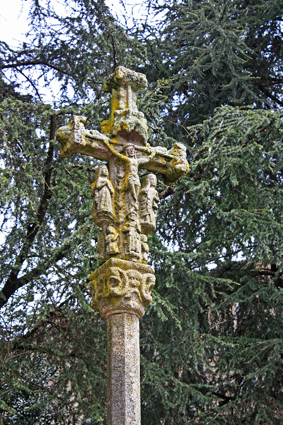 Según algunos especialistas, la labra e iconografía de la cruz sugieren una cronología fijada en torno al último cuarto del XV, siendo de época posterior la plataforma, el pedestal, el fuste y el capitel que conforman el resto del conjunto. La cruz medieval se ve potenciada por remates de botones en flor, colocados en los extremos de los brazos. En su anverso se representa al Crucificado y a ambos lados se disponen las imágenes de la Virgen y de San Juan. Bajo ellos, Santiago Peregrino sobre dos figuras arrodilladas, que Bernardo Barreiro identificó con sus discípulos san Teodoro y san Atanasio. En el reverso, también bajo doselete, se representa a la Virgen sosteniendo al Niño en el brazo izquierdo, a su derecha santa Catalina con la espada y la rueda de su martirio, a la izquierda otra santa difícil de identificar por no portar atributo ninguno; en la parte inferior se sitúa un santo con hábito monacal y debajo él, a ambos lados, otras dos figuras arrodilladas.