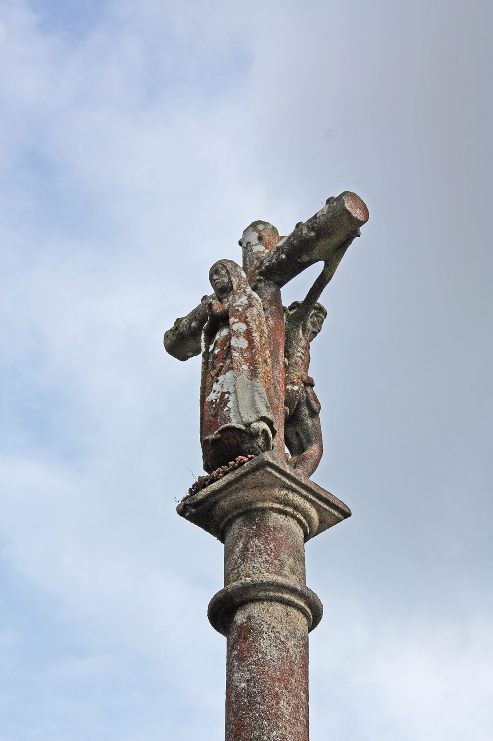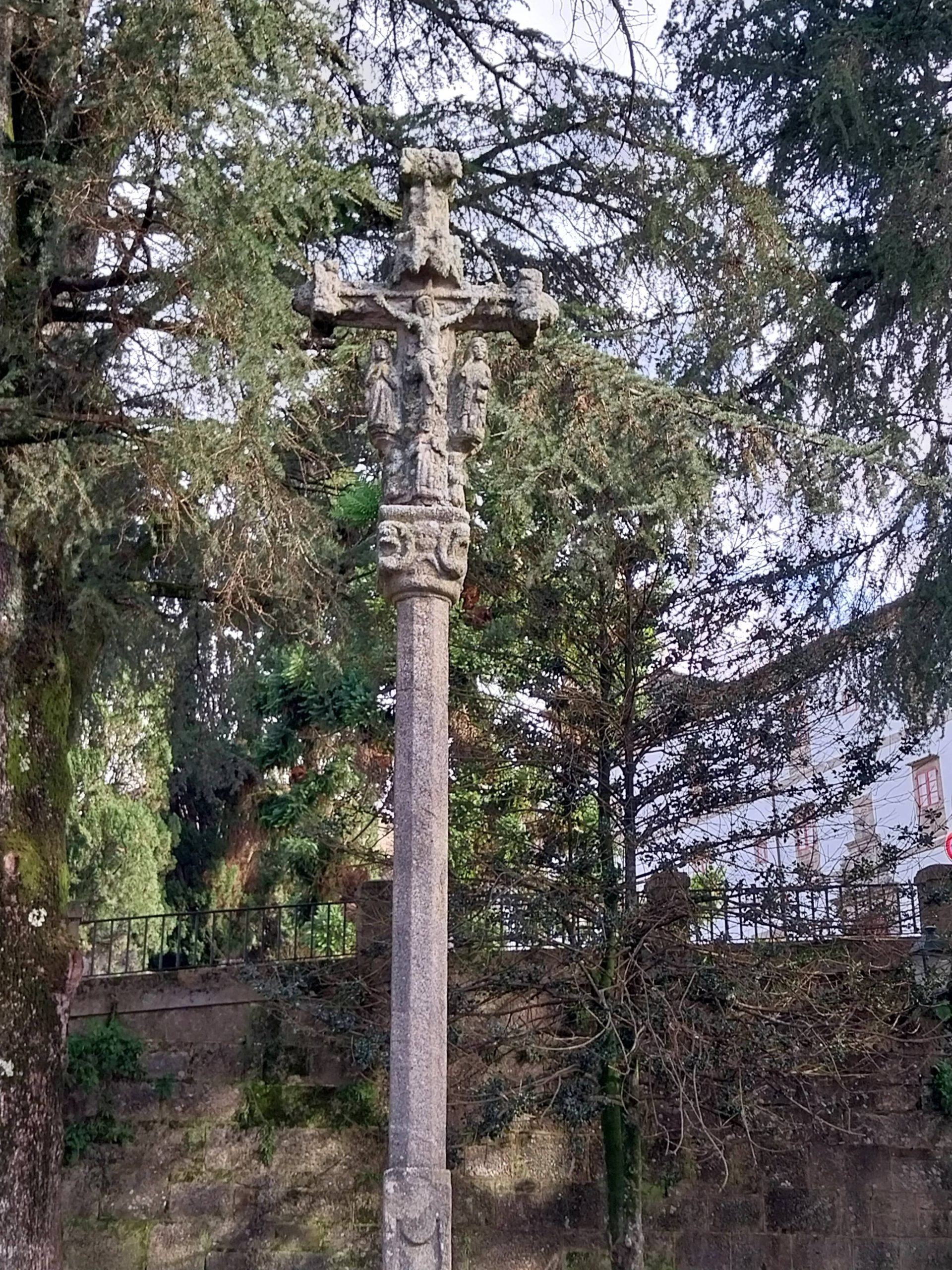 Transitando el Camino Francés, accediendo por lo que hoy es el casco histórico de Santiago de Compostela, nos encontramos en primer lugar con la llamada Rúa dos Concheiros y, a continuación, con el barrio de San Pedro. Entremedias se encuentra una plazuela en la que se alza un crucero del siglo XVIII tallado en granito con las imágenes del Cristo y la Virgen, apoyadas sobre una larga columna de fuste monolítico.
