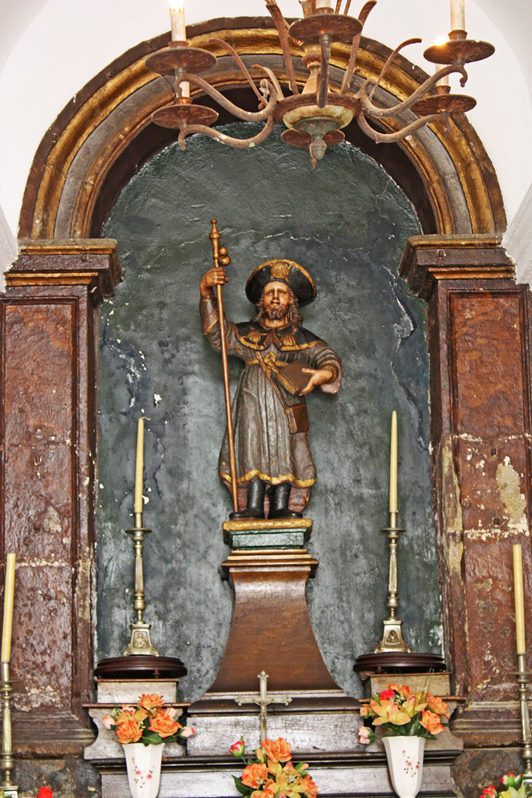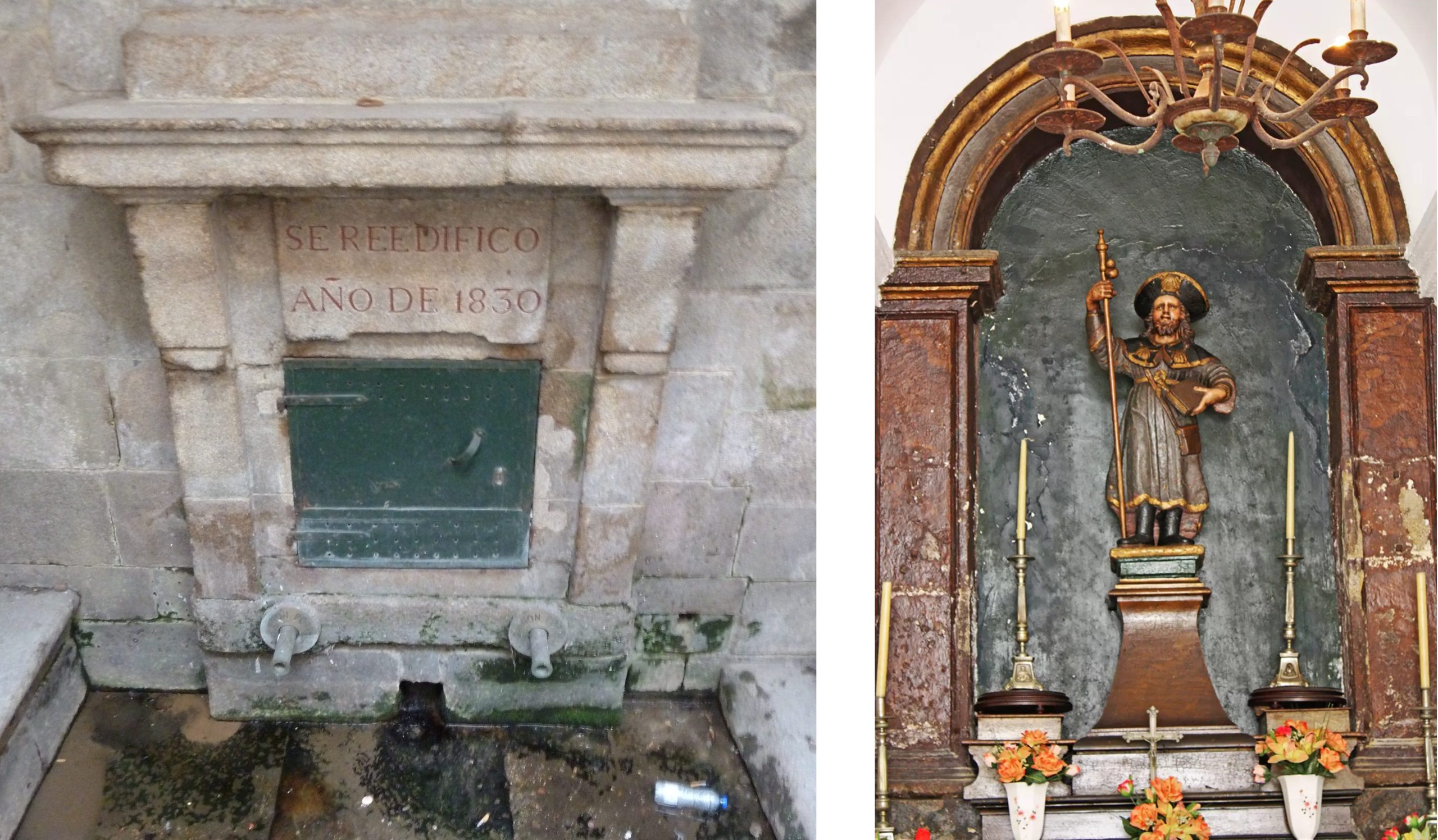 | Detalle de la fuente en Rúa do Franco (izquierda) y detalle del altar en la capilla do Apóstolo (derecha). |