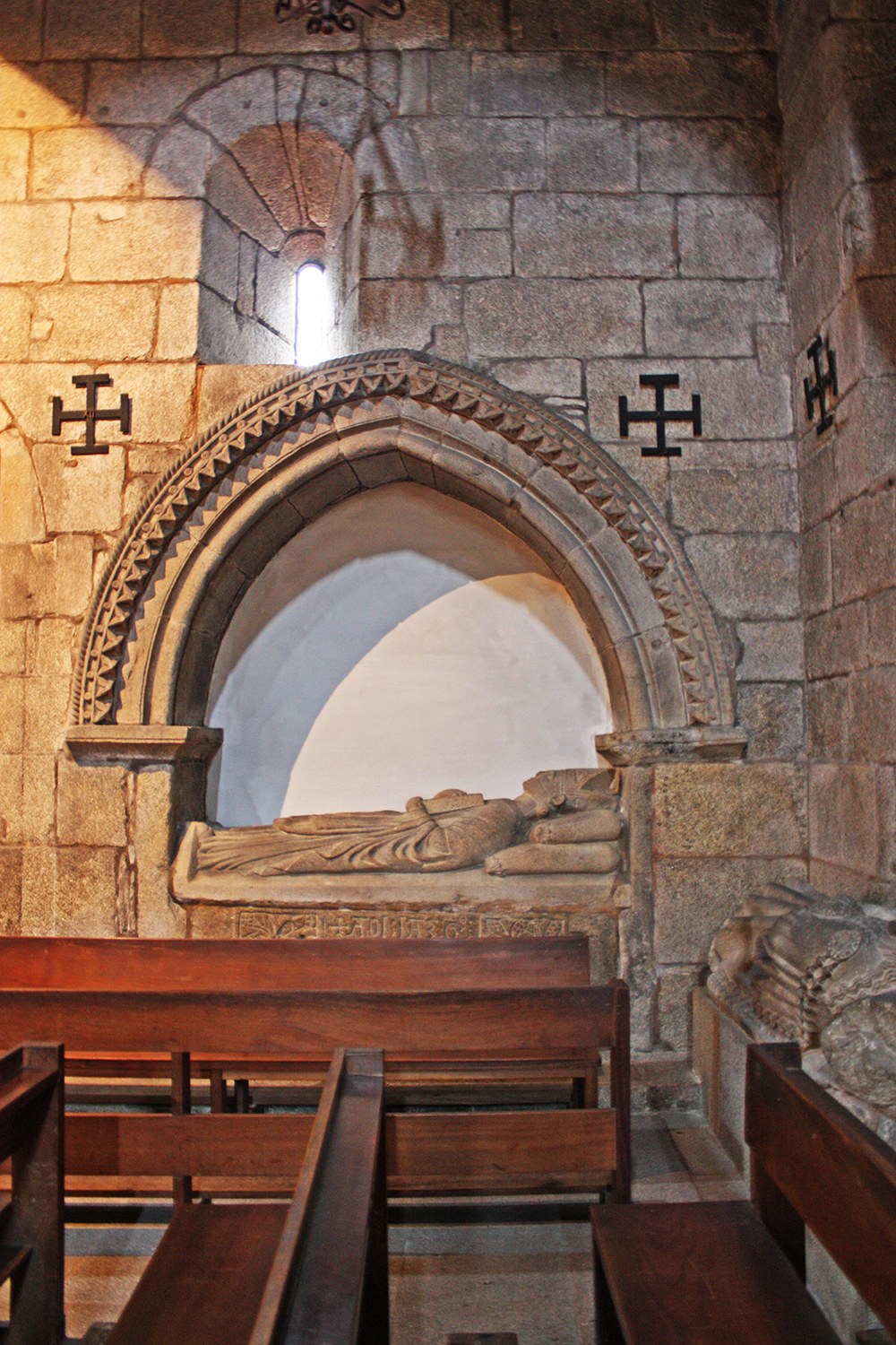 En el interior se ubican diversos enterramientos, siendo el más antiguo el sarcófago con cubierta de estola hallado durante los trabajos de restauración y excavaciones del año 1966. En el muro sur se encuentra el sepulcro del cardenal Gonzalo Eáns fallecido en 1342; su figura yacente viste de pontifical y con las manos sujeta un libro sobre el pecho. Cerca se colocó el yacente femenino encontrado en 1966 que se consideró de finales del siglo XV.