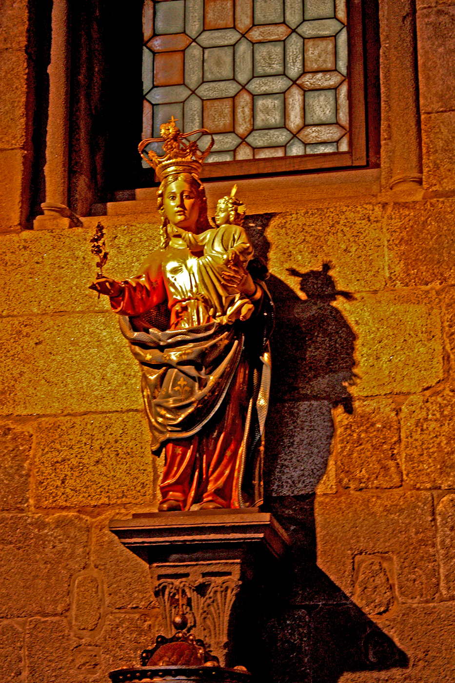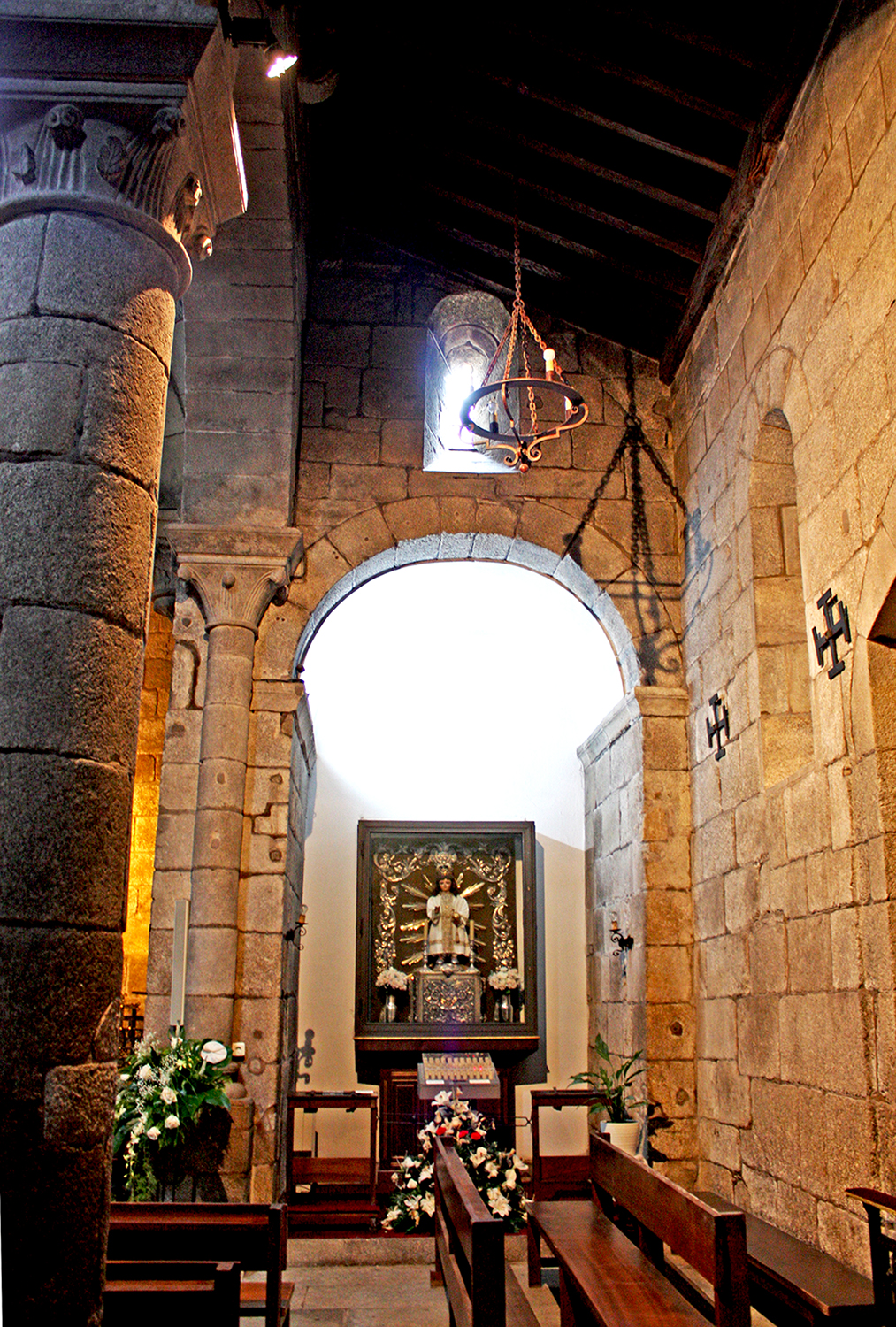 Preside la capilla mayor una imagen de la Virgen de la Consolación del siglo XVI. También cabe destacar la figura del Niño Jesús de origen alemán que se encuentra presidiendo la capilla de la cabecera de la nave sur, es obra del siglo XVIII que perteneció al gremio de tejedores. La capilla de la cabecera de la nave septentrional es la de la confesión sacramental. A los pies de esta misma nave se encuentra una pila bautismal de granito del siglo XVI.