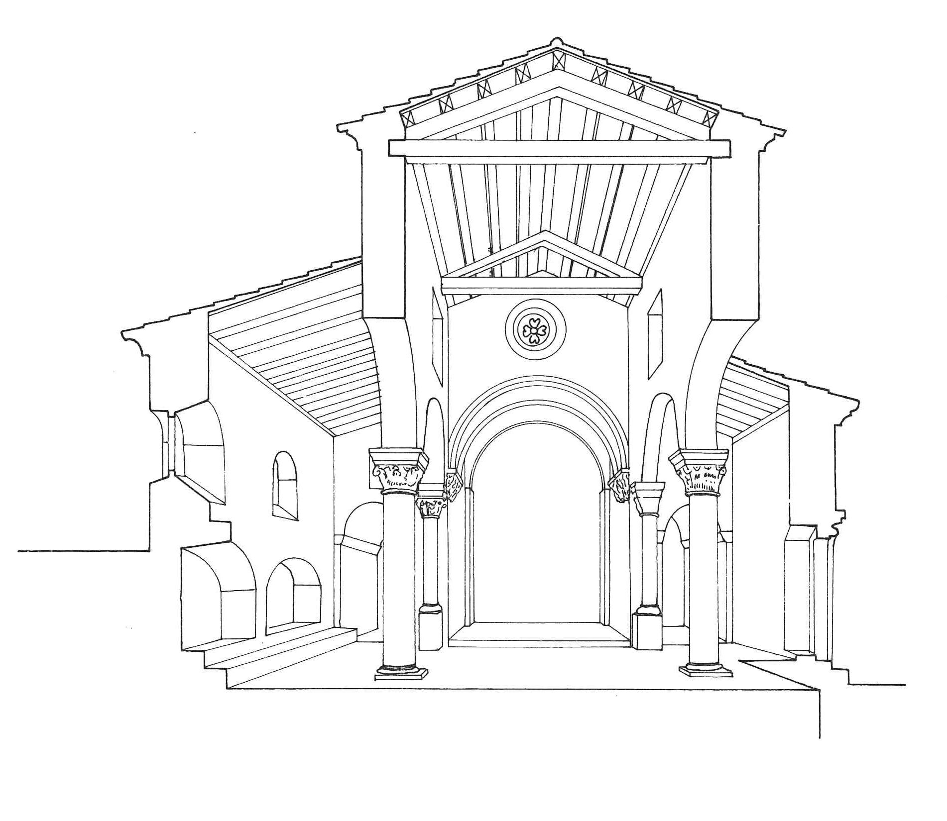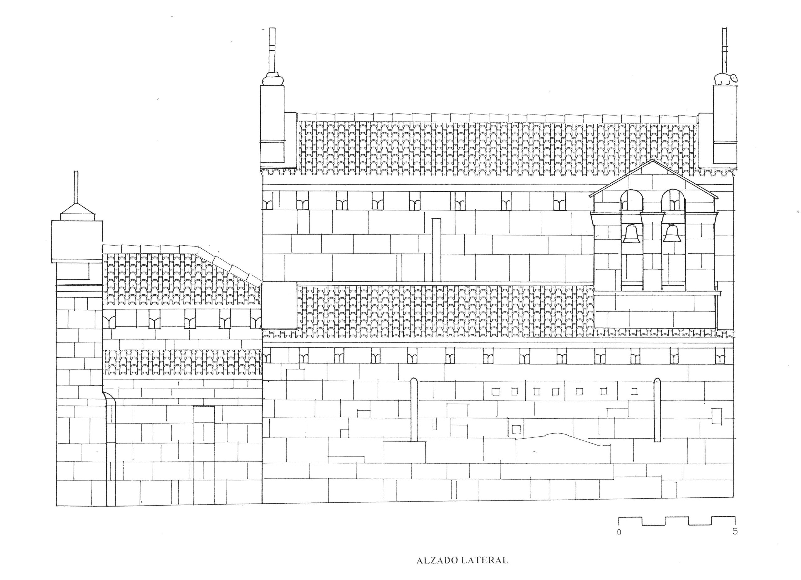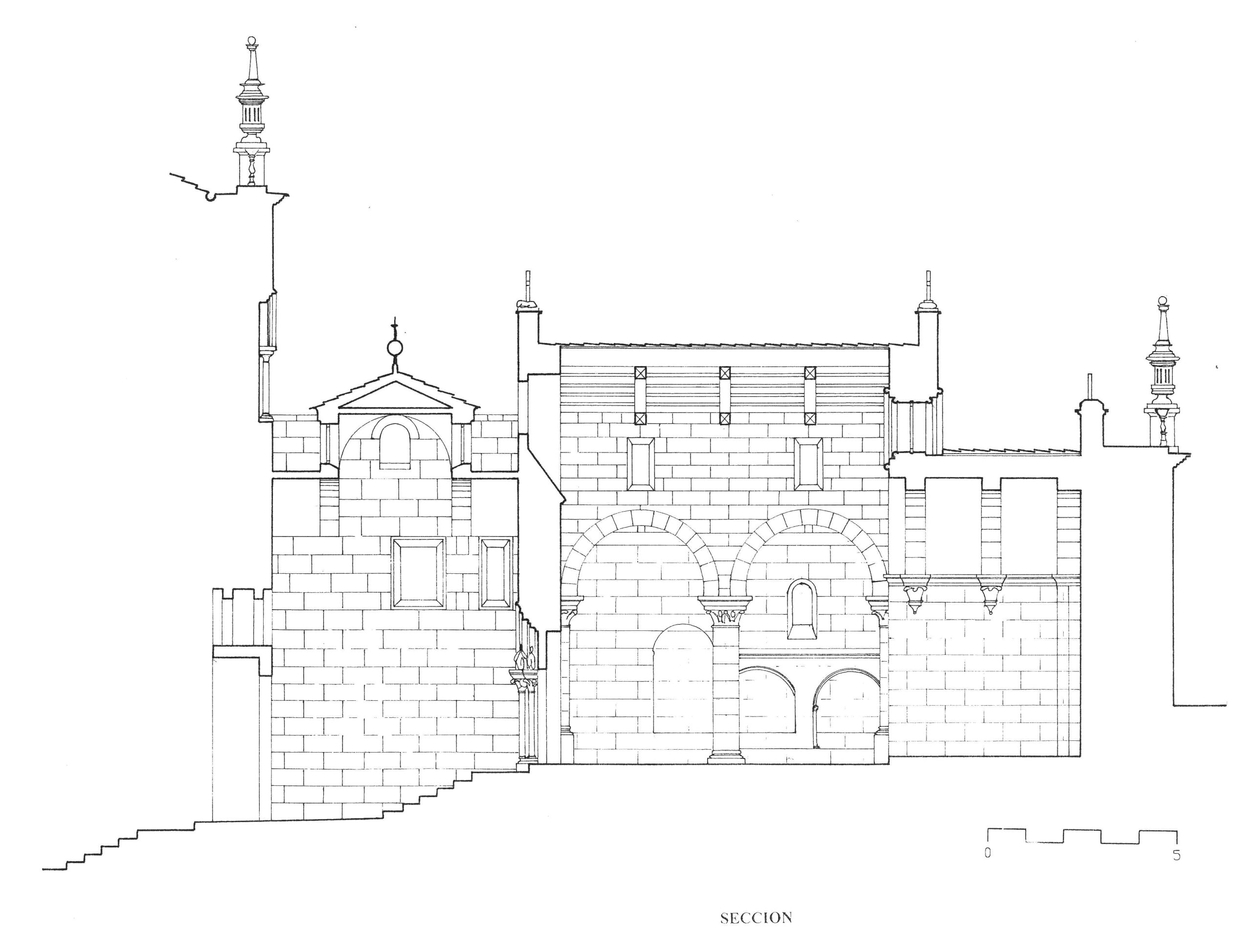 | Sección longitudinal de la iglesia. (José Antonio Franco Taboada, Santiago Tarrío Carrodeguas (dirs.), A arquitectura do Camiño de Santiago: descrición gráfica do Camiño Francés en Galicia, Santiago [de Compostela], Xunta de Galicia, A Coruña, Universidade da Coruña, D.L. 2000). |