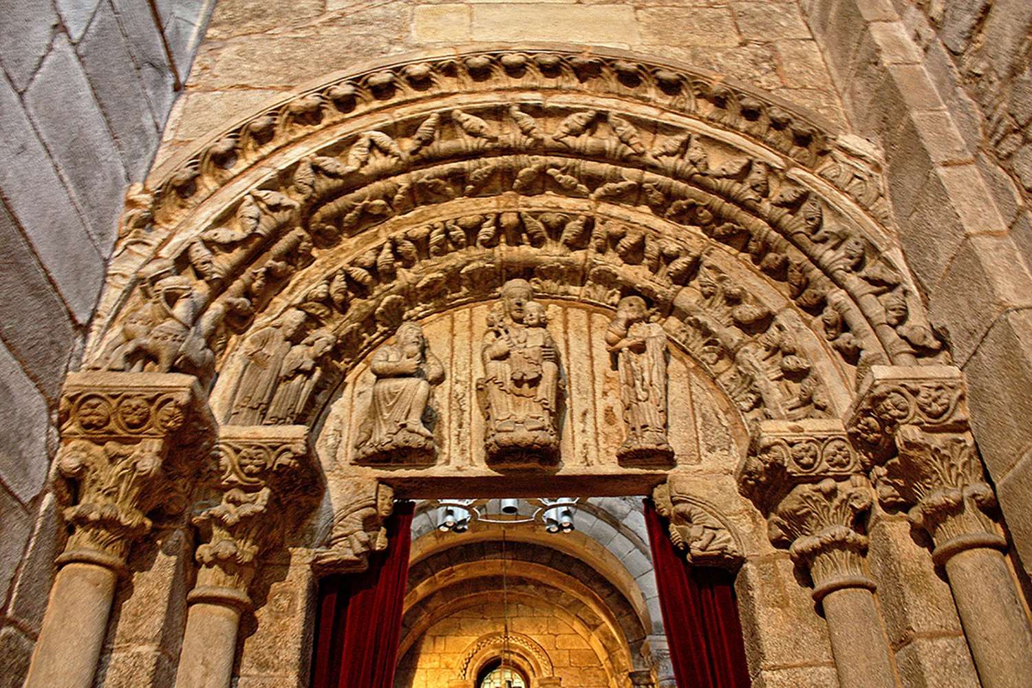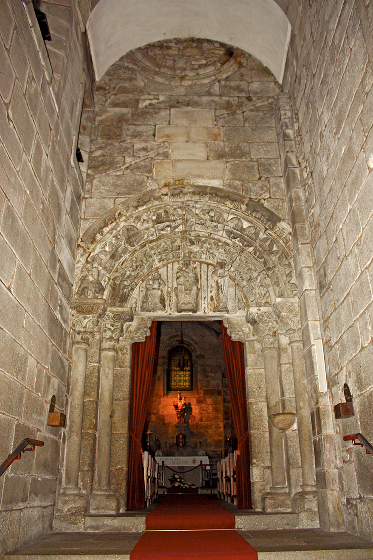 El arco con que remata el vano de la puerta es de medio punto con doble arquivolta que se apoya sobre un par de columnas acodilladas a cada lado. Las columnas son de fustes lisos que se sustentan sobre basas de tradición ática con escaso desenvolvimiento de las molduras. Sus capiteles son de hojas de acanto vueltas hacia el frente bajo cimacios decorados con un tallo ondulante con hojas y frutos. Las arquivoltas están molduradas y generan escocias amplias sobre las que se labraron hojas radiales de extremos enrollados y puntos trepanados. Las arquivoltas enmarcan el tema de la Epifanía representado en el tímpano, las figuras de María con el Niño, San José y el primero de los tres Reyes Magos. Están talladas en piezas independientes que se encajaron en el tímpano ocupándolo por completo según la técnica empleada en el propio Pórtico da Gloria. Los otros dos magos y sus caballos se colocaron en el arranque izquierdo de los arcos, disposición única, cuyo posible modelo fue el trascoro que el taller del maestro Mateo realizó en la nave de la catedral.