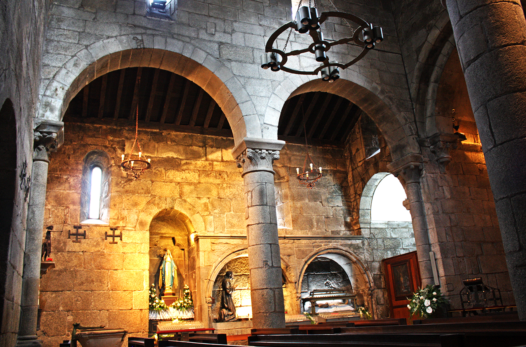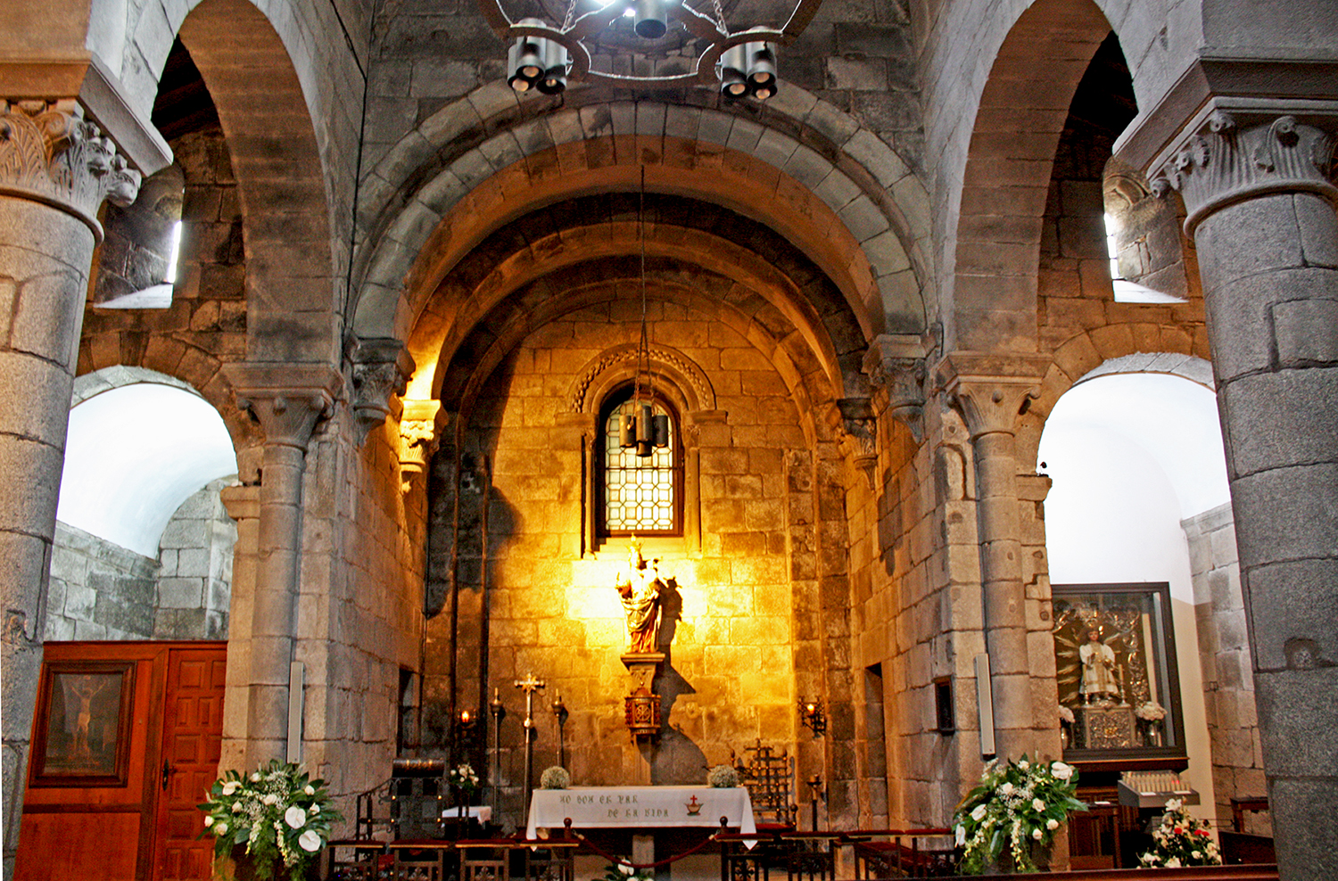 En el interior, la iglesia se divide en tres naves, siendo la central de mayor anchura y altura que las laterales. Estas se dividen mediante arcos formeros de medio punto que descargan sobre capiteles moldurados que reciben un fuste de sección circular sobre alta basa. En la parte superior de las arcadas se abren vanos para la iluminación interior de las naves, a lo que también colabora el vano horadado en el muro del testero, este en forma de arco de medio punto sobre impostas que se apoyan en sendas columnillas con capiteles decorados con motivos vegetales. El arco de la ventana está orlado por una moldura que se adorna con un motivo ajedrezado. La nave central está cubierta por una bóveda pétrea de cañón formada a partir de dos arcos fajones apoyados sobre impostas empotradas en los muros laterales con capiteles decorados con elementos vegetales.