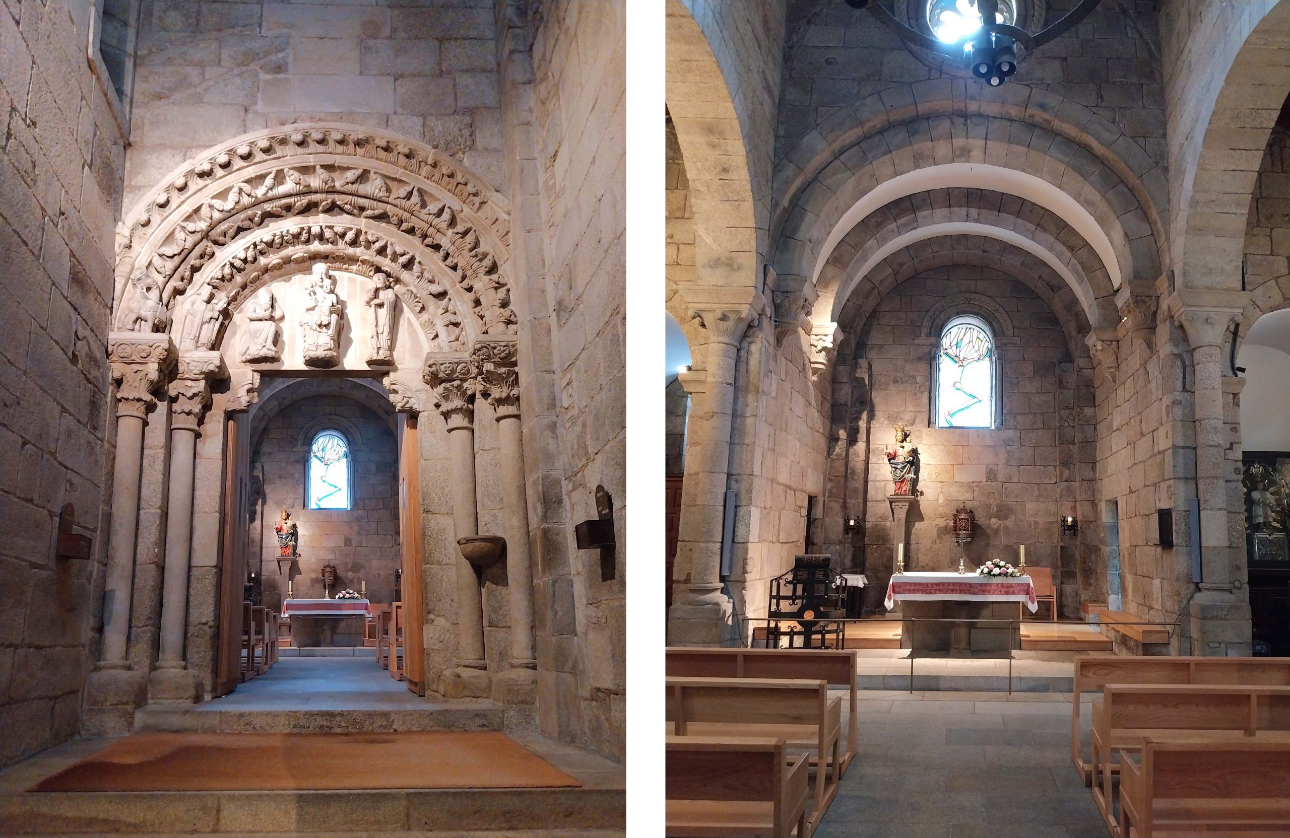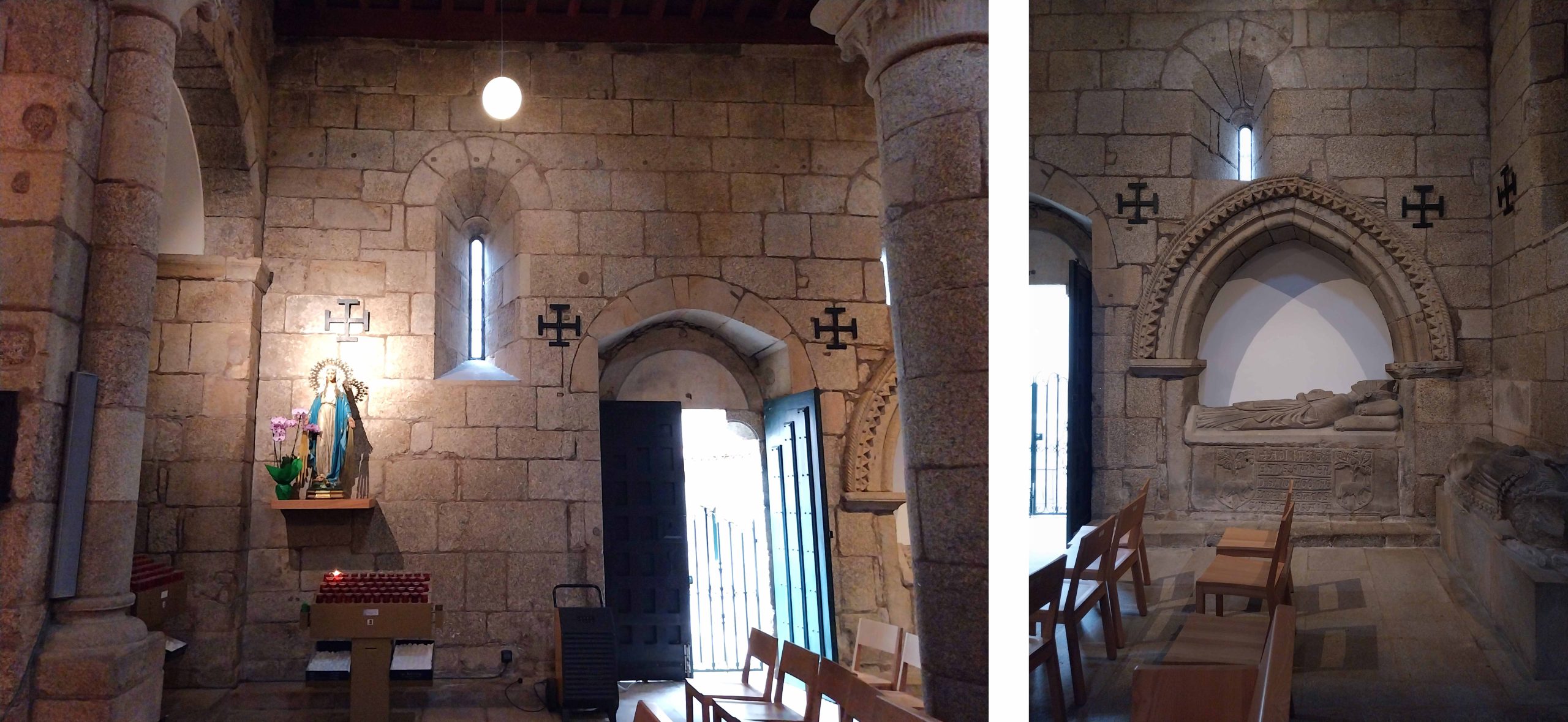 | Portada oeste de acceso a la iglesia (izquierda) e interior de la nave central de la iglesia (derecha). |