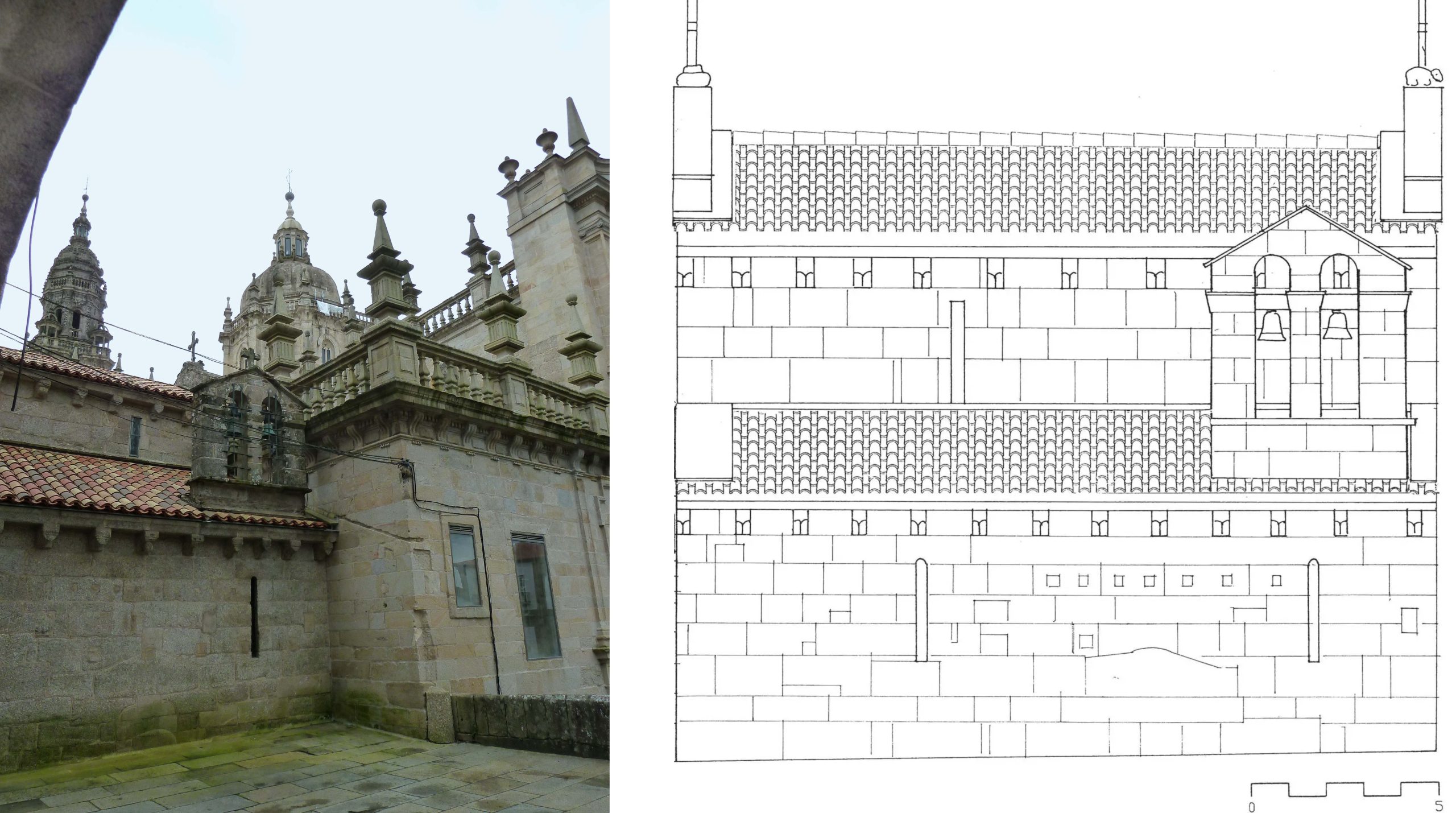 | Exterior de la iglesia de Santa María de Corticela en el contexto inmediato de la catedral (izquierda) y alzado de la misma fachada, (José Antonio Franco Taboada, Santiago Tarrío Carrodeguas (dirs.), A arquitectura do Camiño de Santiago: descrición gráfica do Camiño Francés en Galicia, Santiago [de Compostela], Xunta de Galicia, A Coruña, Universidade da Coruña, D.L. 2000) (derecha). |