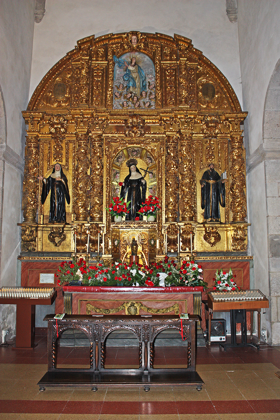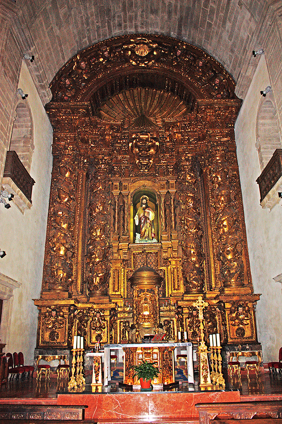 De estilo barroco, se compone de un cuerpo principal con una calle central flanqueada por cuatro columnas salomónicas gigantes que se alzan sobre un pedestal dispuesto en distintos planos. El pedestal se decora mediante sartas de frutas y cabezas de ángeles y las cuatro columnas de fuste helicoidal están ornadas con pámpanos de vid. En la parte baja de la calle central se encuentra el tabernáculo realizado en el siglo XIX por Manuel de Prado, que recuerda a un templete clásico con cuatro columnas salomónicas de seis vueltas decoradas con pámpanos de vid. Las columnas sostienen el anillo de arranque de una cúpula semiesférica coronada con la figura de la Fe.