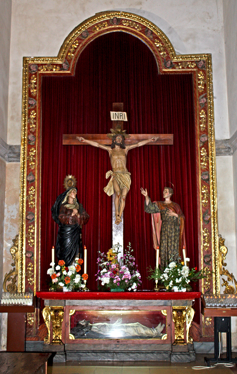 El retablo del Cristo de la buena muerte preside la tercera capilla del lado norte. Fue realizado hacia el año 1920 por J. Rivas. Está presidido por un grupo escultórico que tiene como fondo un telón con un marco dorado que representa la crucifixión de Cristo con las imágenes de la Virgen María y San Juan al pie de la cruz. La escena está cargada de un fuerte naturalismo y a la vez dramatismo a través de los rostros y los gestos tanto de María como de san Juan. Al pie del conjunto se dispone un altar realizado con mármoles rojizos y grises que cobija en una urna de cristal el cuerpo de Cristo yacente mostrando sus llagas.