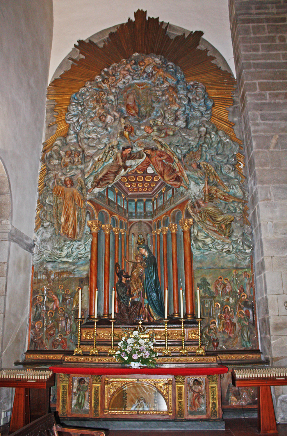 El retablo que preside la capilla mayor se levanta sobre un zócalo de jaspes y mármoles realizado en 1671 por Miguel de Herbay, un marmolista flamenco avecinado en la ciudad de Santiago. Es posible que este zócalo sirviese de base al retablo de la primitiva ermita de Nuestra Señora de la Cerca, realizado por Juan de Báscoas en 1628 y remodelado por Bernardo Cabrera en 1631, siendo posteriormente trasladado a la capilla mayor de la nueva iglesia. No obstante, según Otero Túñez, el retablo que hoy podemos ver es obra originaria de Pedro de Taboada, discípulo de Mateo de Prado, quien probablemente lo terminase en el año 1701.