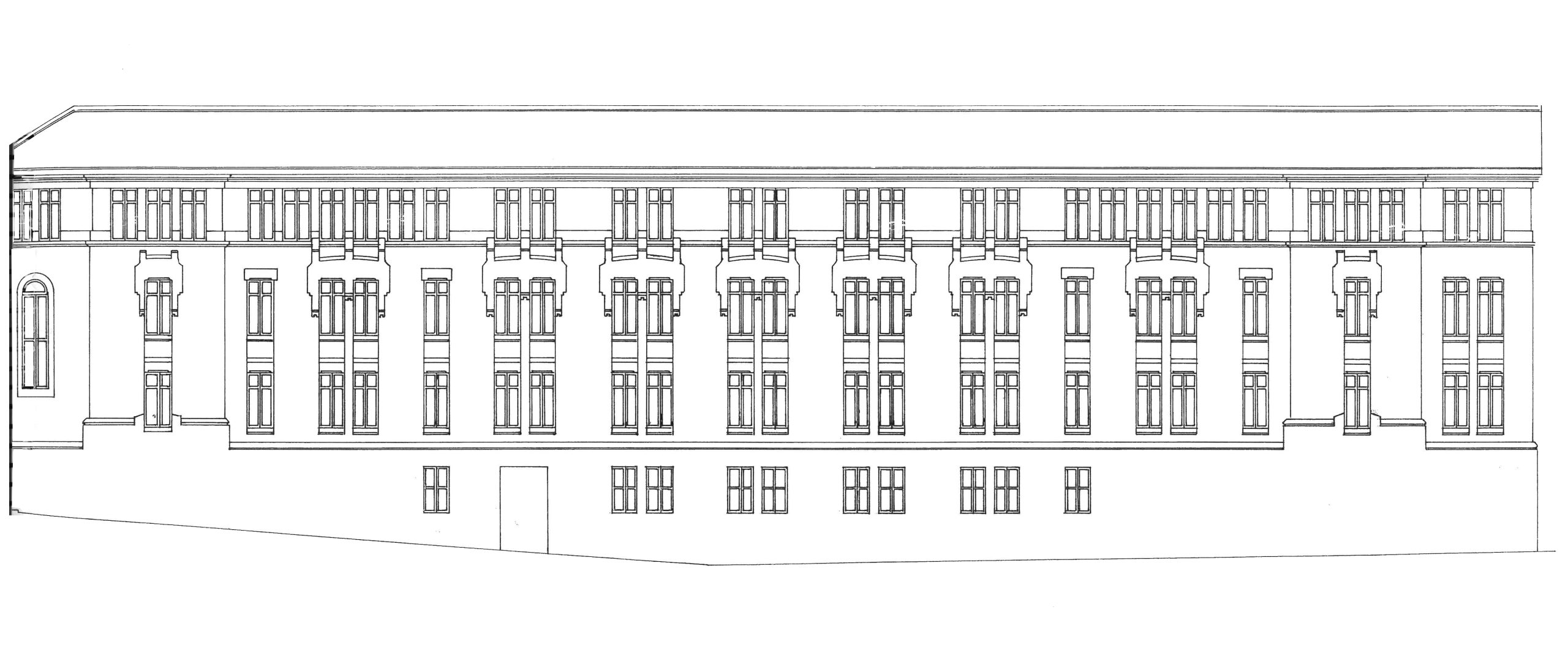 | Alzado del frente posterior del convento. (José Antonio Franco Taboada, Santiago Tarrío Carrodeguas (dirs.), A arquitectura do Camiño de Santiago: descrición gráfica do Camiño Francés en Galicia, Santiago [de Compostela], Xunta de Galicia, A Coruña, Universidade da Coruña, D.L. 2000). |