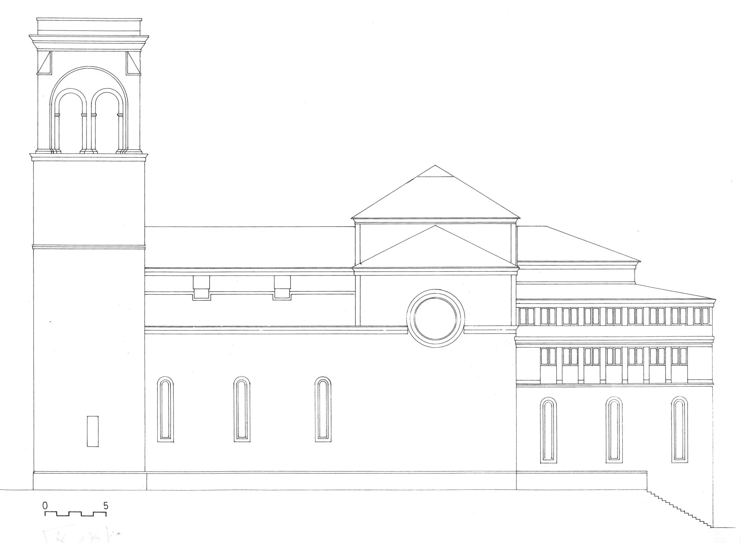 | Alzado del lado meridional de la iglesia y del monasterio. (José Antonio Franco Taboada, Santiago Tarrío Carrodeguas (dirs.), A arquitectura do Camiño de Santiago: descrición gráfica do Camiño Francés en Galicia, Santiago [de Compostela], Xunta de Galicia, A Coruña, Universidade da Coruña, D.L. 2000). |