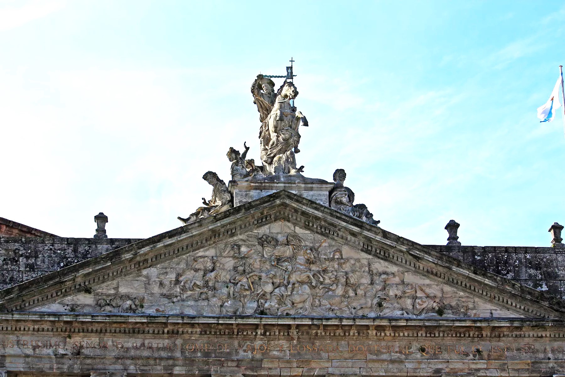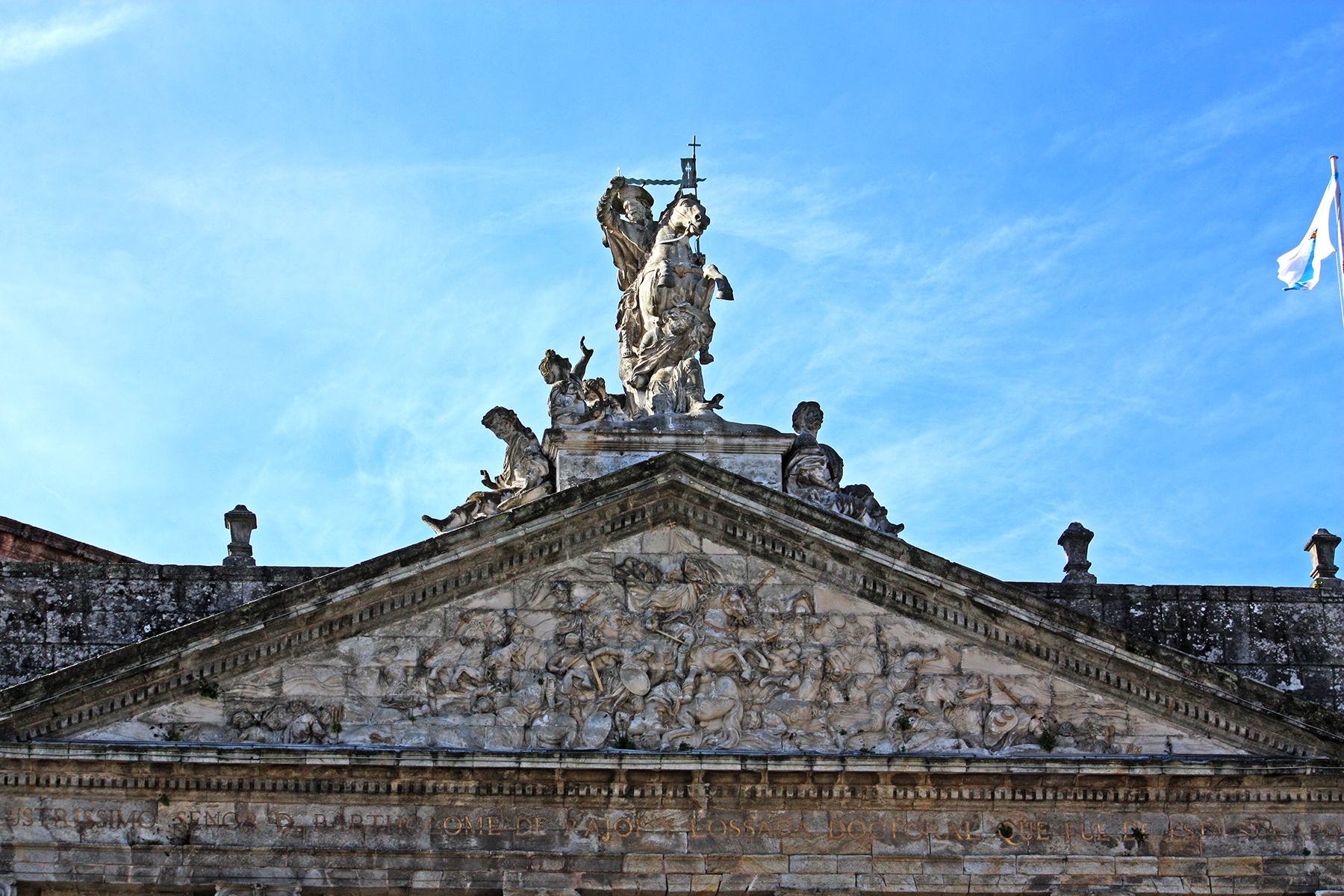 | Detalle del frontón y del grupo escultórico de Santiago Matamoros. |