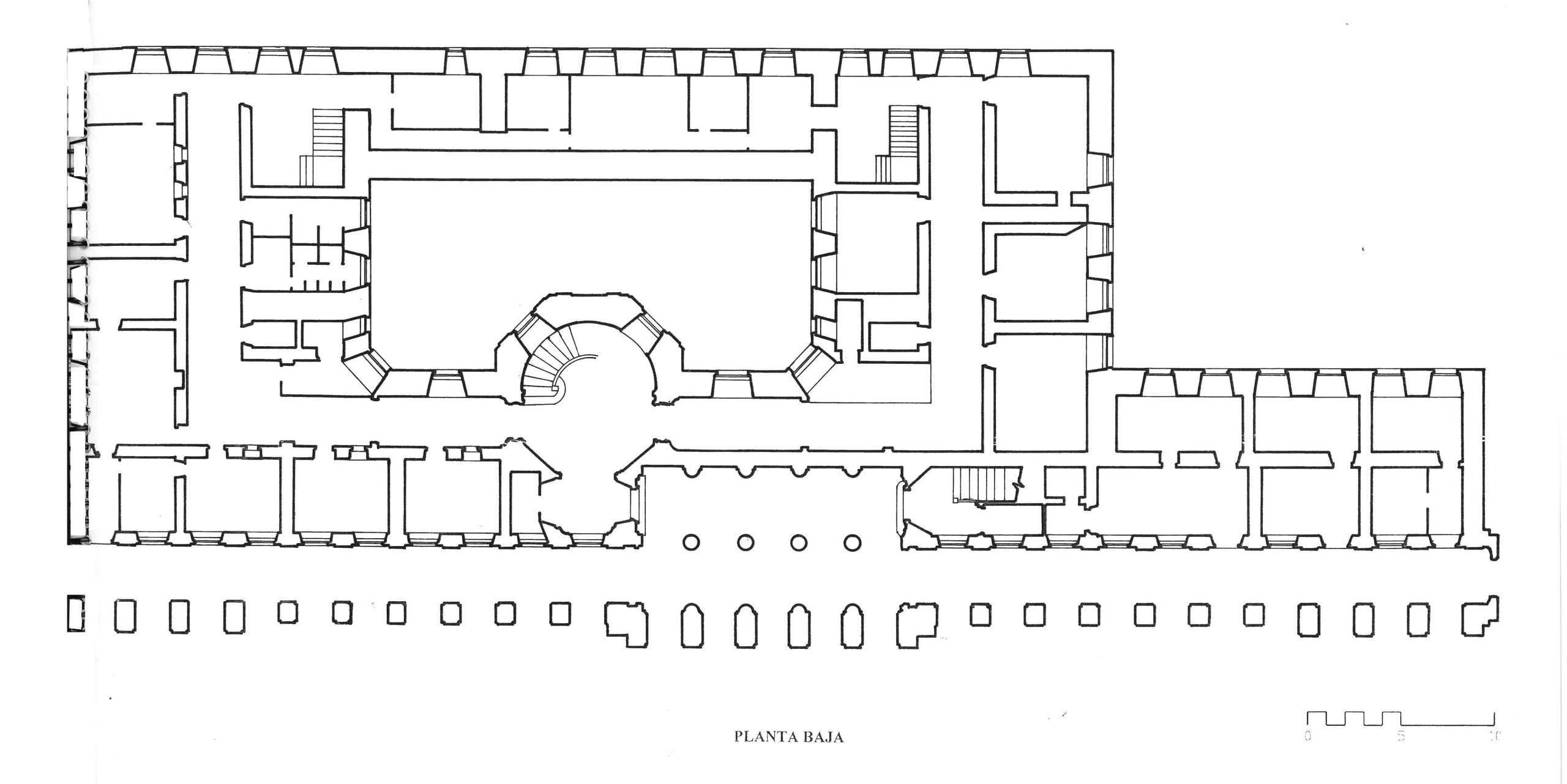 | Planta baja correspondiente a la entrada principal del palacio. (José Antonio Franco Taboada, Santiago Tarrío Carrodeguas (dirs.), A arquitectura do Camiño de Santiago: descrición gráfica do Camiño Francés en Galicia, Santiago [de Compostela], Xunta de Galicia, A Coruña, Universidade da Coruña, D.L. 2000). |