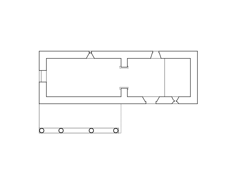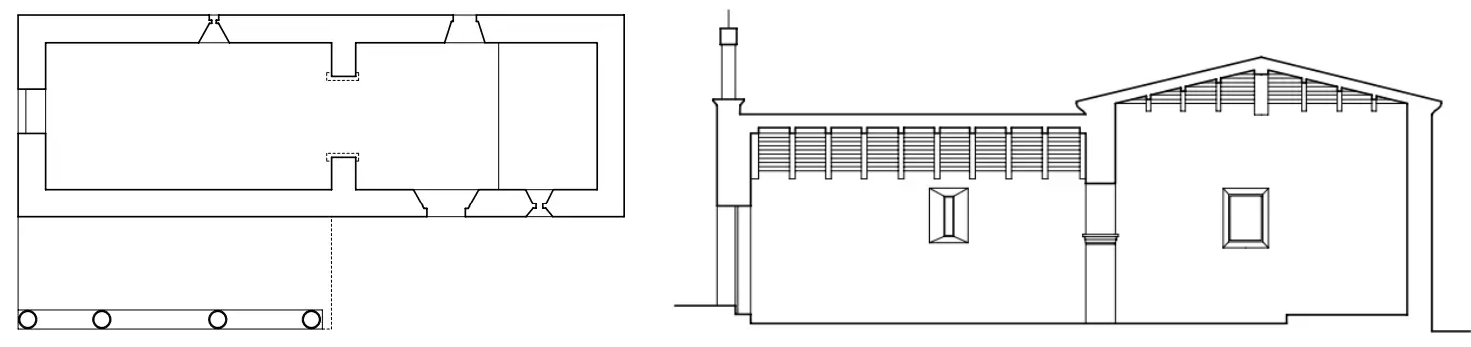 | Plano de la planta (izquierda) y sección longitudinal (derecha) de la capilla de San Lázaro. (José Antonio Franco Taboada, Santiago Tarrío Carrodeguas (dirs.), A arquitectura do Camiño de Santiago: descrición gráfica do Camiño Francés en Galicia, Santiago [de Compostela], Xunta de Galicia, A Coruña, Universidade da Coruña, D.L. 2000). |