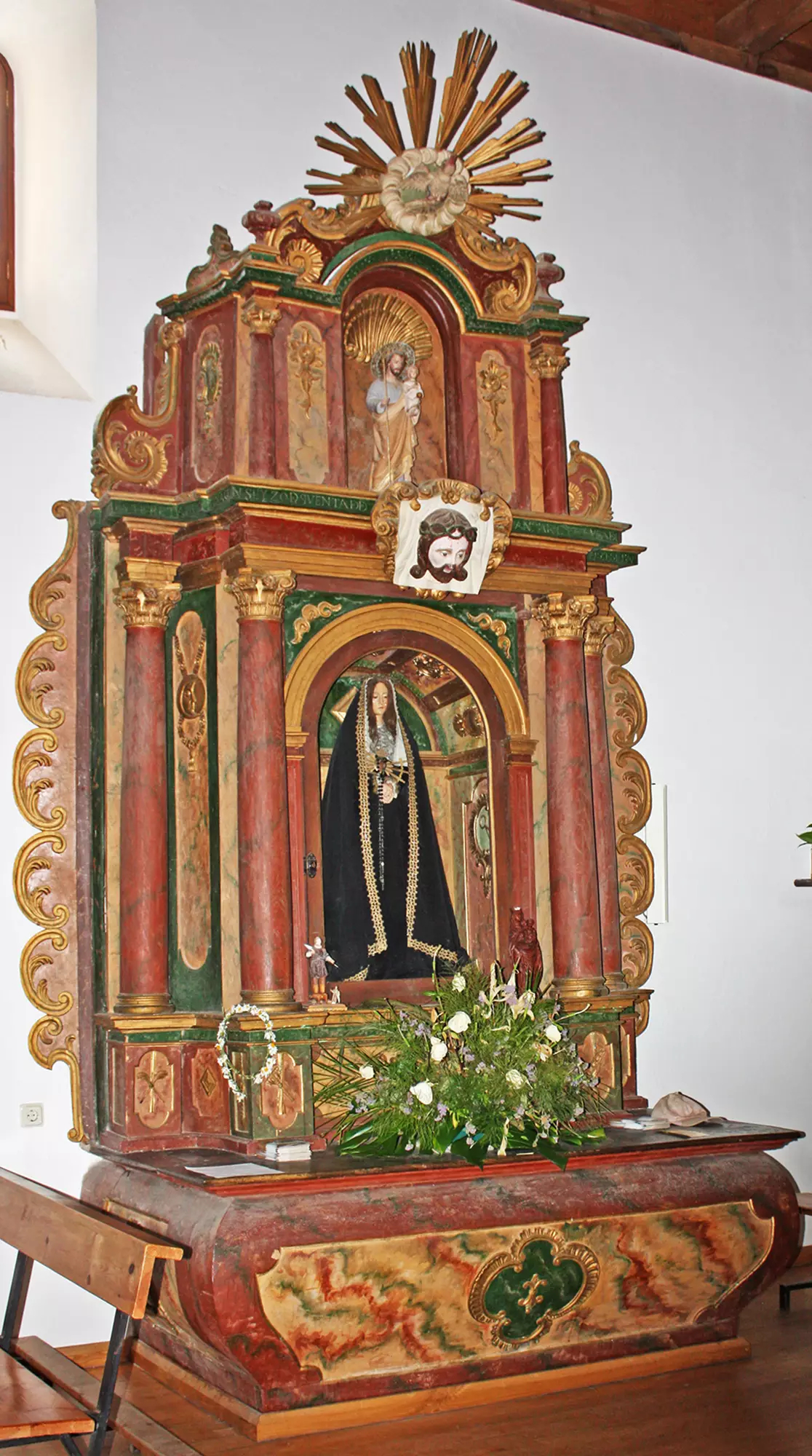 El templo cuenta con un segundo retablo ubicado en la nave, en el lado del Evangelio, de una factura muy diferente al del altar mayor. Este, del siglo XIX continúa el estilo barroco en sus trazas pero predomina la policromía sobre los dorados. Con una paleta de pardos y burdeos, formas sinuosas bordeando el conjunto y una estructura común, el retablo se alza sobre una mesa de altar de bordes curvilíneos a la que siguen un banco y un primer cuerpo que adelanta el espacio central, el dedicado a la imagen de la Virgen de los Dolores, sobresaliendo de los elementos laterales. La Virgen está enmarcada en espacio abovedado y decoración interior y flanqueada en el exterior por columnas de fuste liso, basa ática y capitel corintio, al igual que las exteriores. Sobre este conjunto, que remata en un entablamento en cuyo centro se dispone la efigie de la Santa Faz, se eleva un ático que sigue una estructura similar y que ubica en el centro la imagen de San José con el Niño. Corona todo el conjunto un medallón orlado de haces de luz, que tiene en el centro la paloma del Espíritu Santo asomando entre un círculo de nubes.