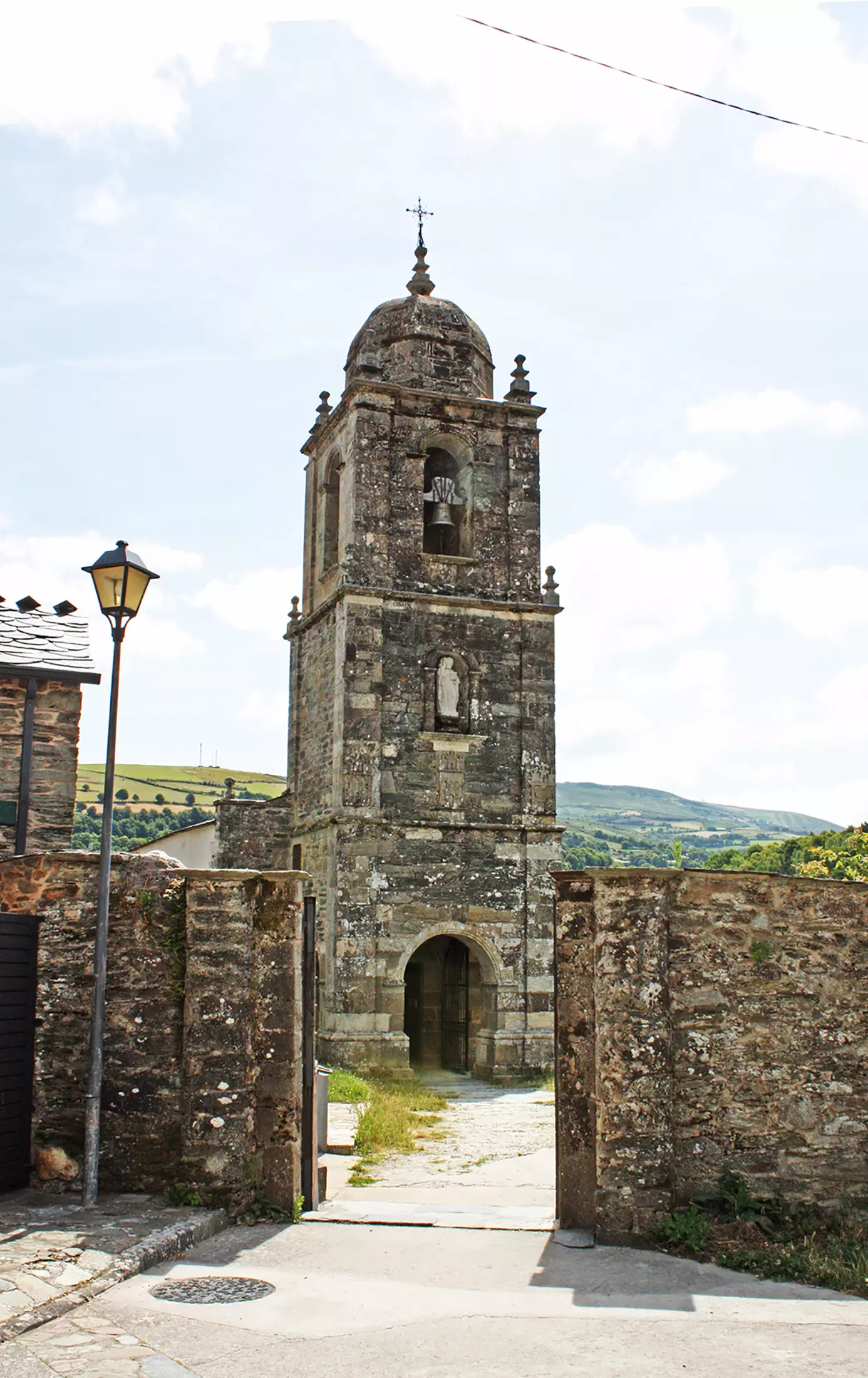Fachada principal y torre del campanario de la iglesia.